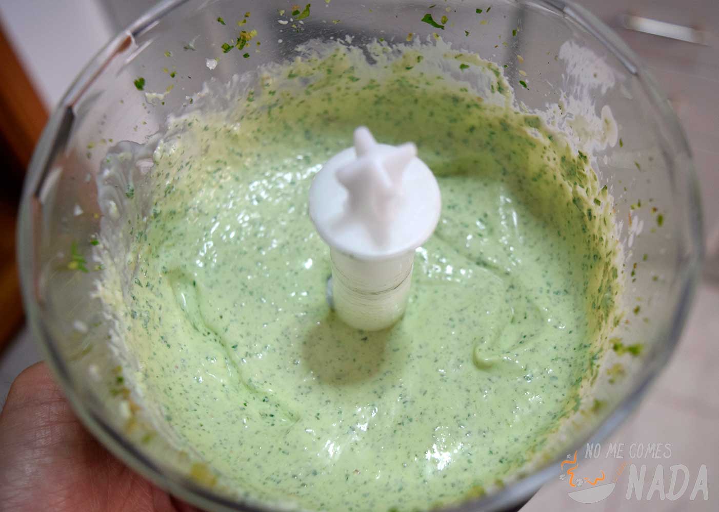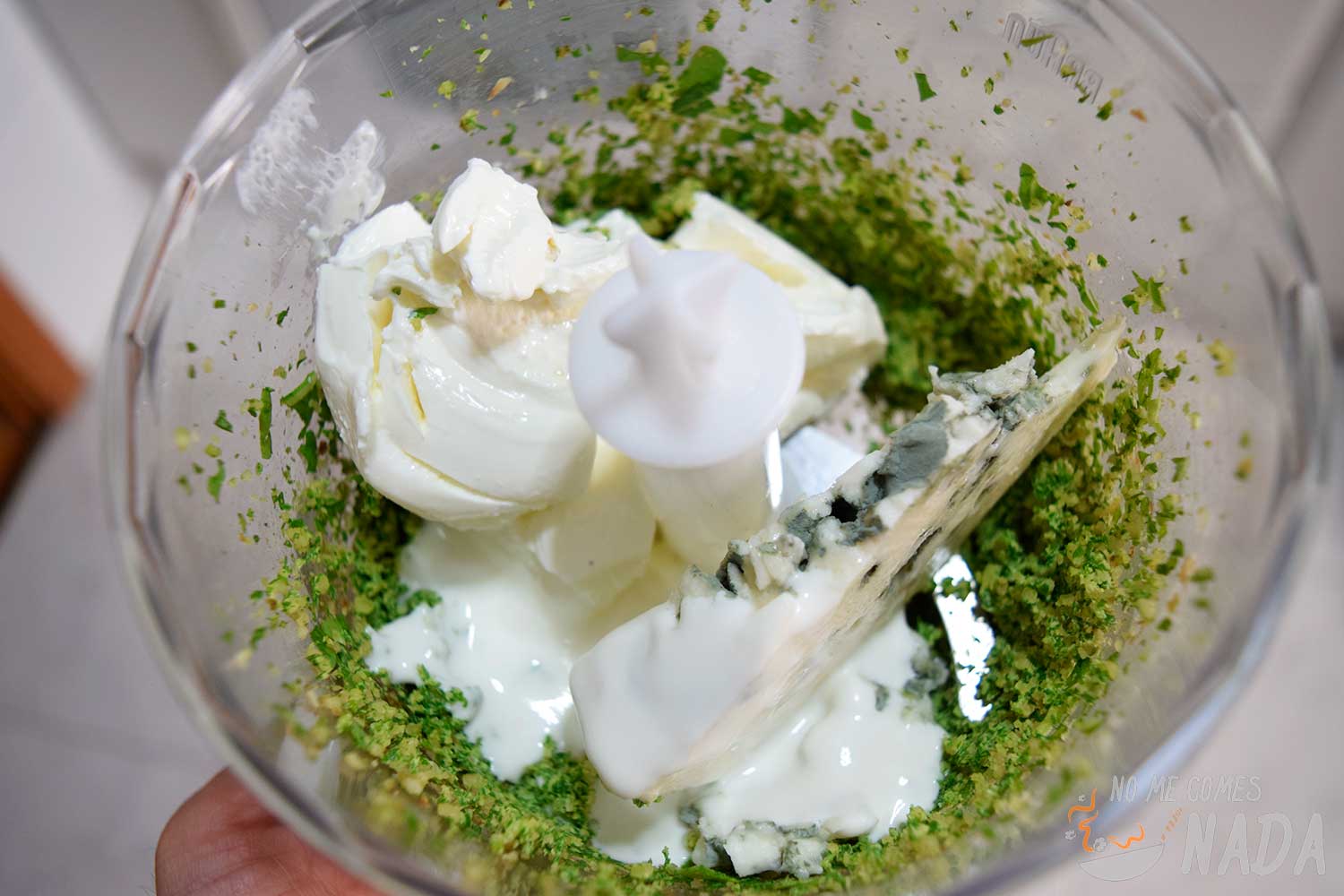 La crema de queso de la receta es de las típicas que vienen con la Thermomix, pero los que no podemos contar con dicho aparato de cocina, también podemos disfrutarla simplemente echando mano de la picadora.