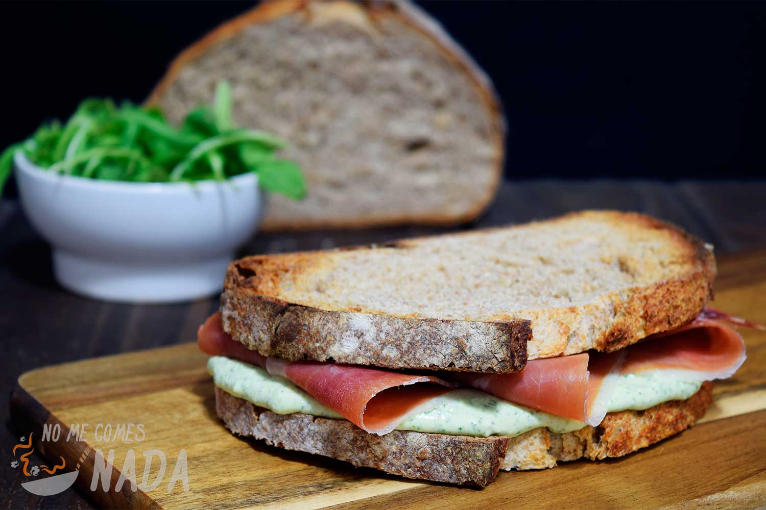 Ya tenemos listo nuestro bocadillo cremoso de roquefort, rúcula y nueces con jamón serrano, una alternativa perfecta al tradicional sándwich.