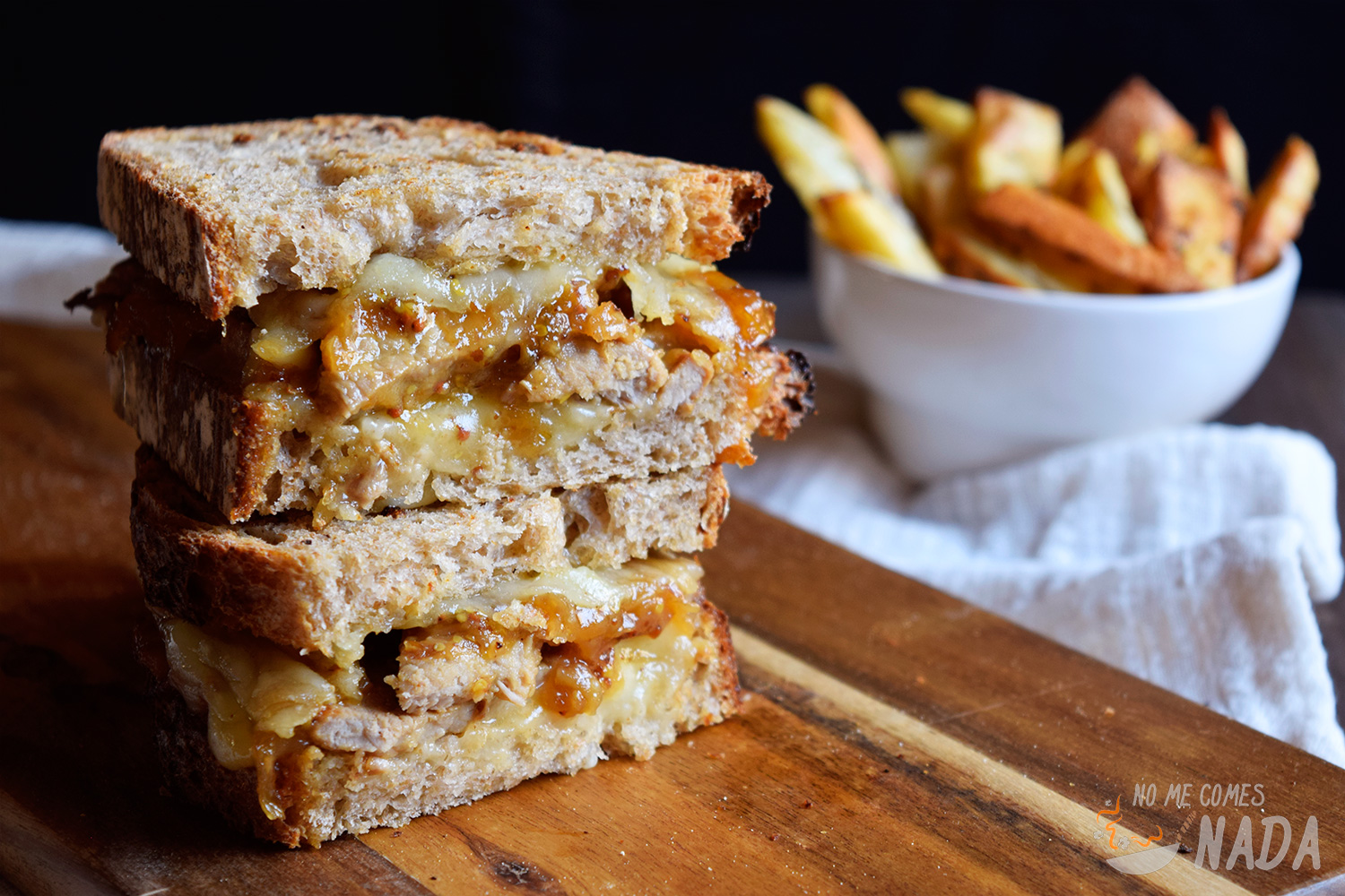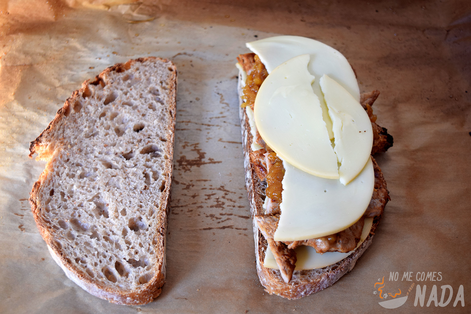 Pues con todos los ingredientes listos, vamos a montar el sándwich de la siguiente manera: pan, queso, tiras de ternera, cebolla caramelizada, salsa de mostaza y miel, queso y pan.
