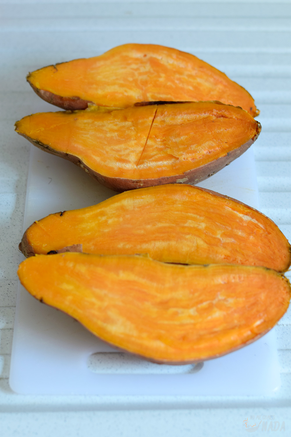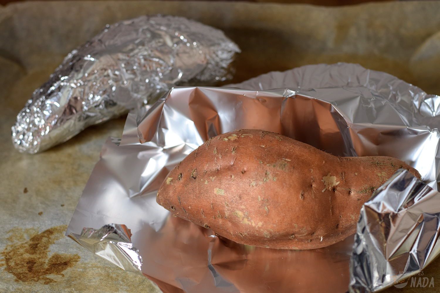 Envolvemos los 2 boniatos en papel de aluminio y los metemos al horno a 200ºC para asarlos. Depende del tamaño de los boniatos variará el tiempo de asado, id revisando hasta que estén blando (probad punchando con un cuchillo). Tardarán unos 40-50 minutos.