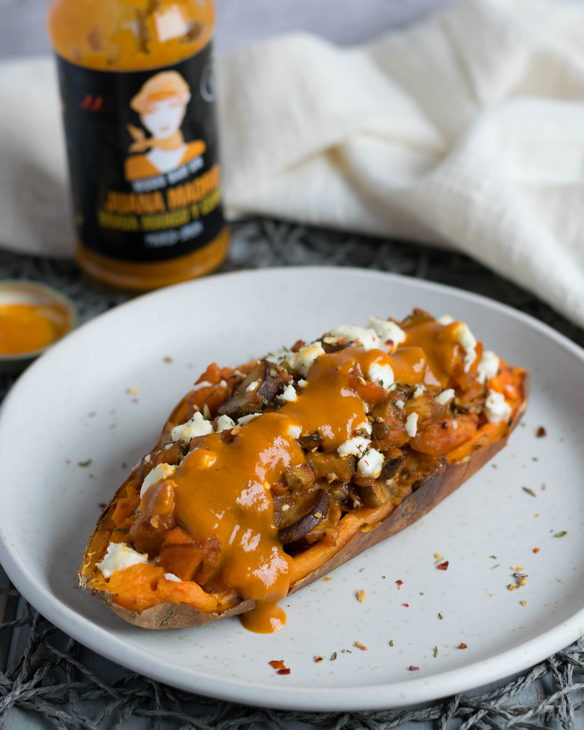 Más concretamente el toque de salsa brava Juana Madrid, con la que ya os he enseñado varias recetas. Se me ocurrió la idea de hacer un boniato relleno con setas y salsa brava sin saber muy bien cómo iba a combinar esta última con el resto de sabores, pero es que una salsa brava sienta bien a casi cualquier cosa. Y, sobre todo, me ha encantado como combina perfectamente con el queso de cabra.