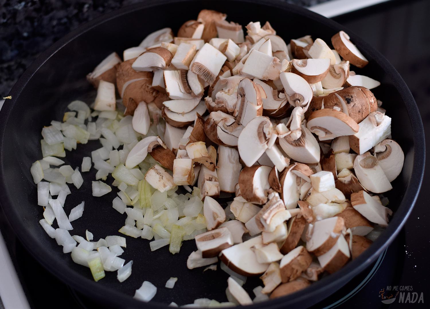 Picamos finamente la cebolla y la ponemos en una sartén a fuego medio-bajo con un chorrito de aceite de oliva virgen extra para que se vaya pochando lentamente. Cuando esté blanda y empiece a trasparentar, añadimos los champiñones troceados. Cocinamos hasta que los champiñones han soltado el agua y reducido.