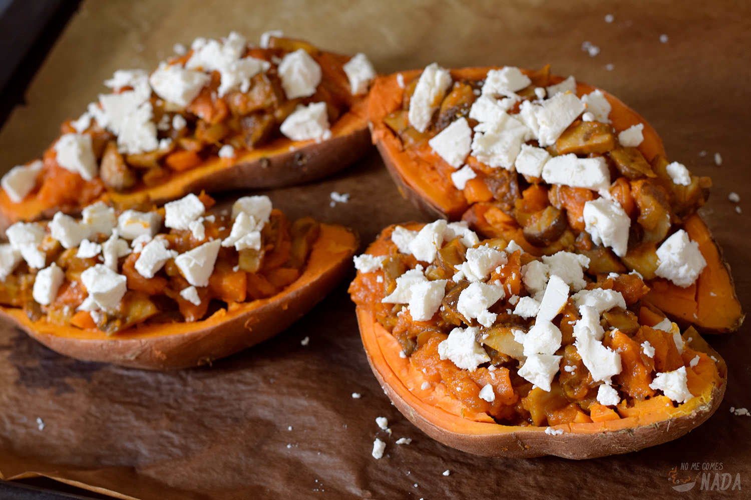 Rellenamos los boniatos con la mezcla del relleno y desmenuzamos queso de cabra por encima. Gratinamos unos minutos en el horno para que el queso quede en su punto.