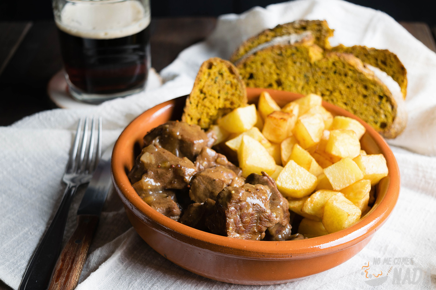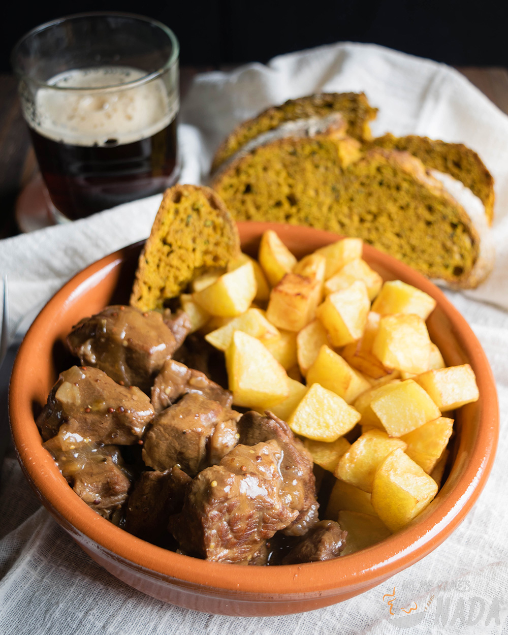 Servimos la carbonade flamande acompañada de una buena ración de patatas fritas (los belgas son muy de comer “fries”). Yo, para evitar tanta fritura, he optado por unas patatas risoladas, que son más ligeras, una cerveza negra bien fresquita y pan de cúrcuma casero, porque la salsa esta para mojar muuuuucho.