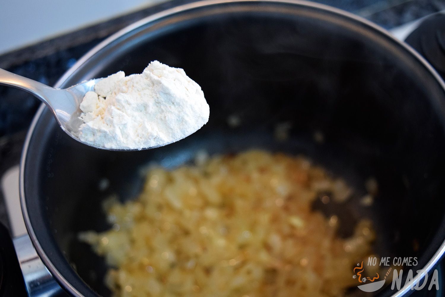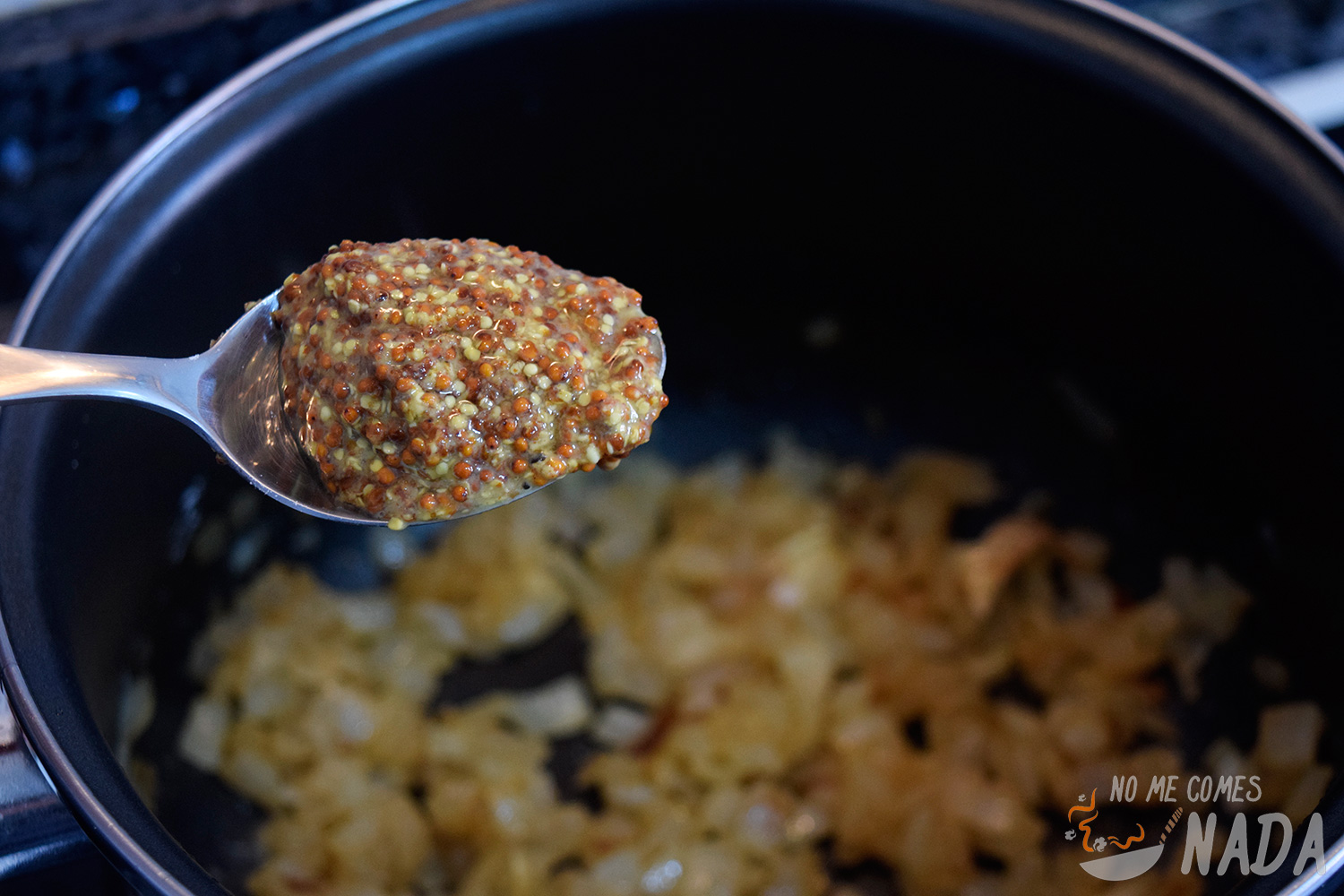 Retiramos la carne, bajamos el fuego y añadimos una nuez de mantequilla junto con la cebolla picada. Dejamos pochar la cebolla lentamente hasta que empiece a transparentar y a ablandarse. Agregamos la harina y la mostaza, removemos para que se reparta bien y dejamos un par de minutos para que se haga la harina.