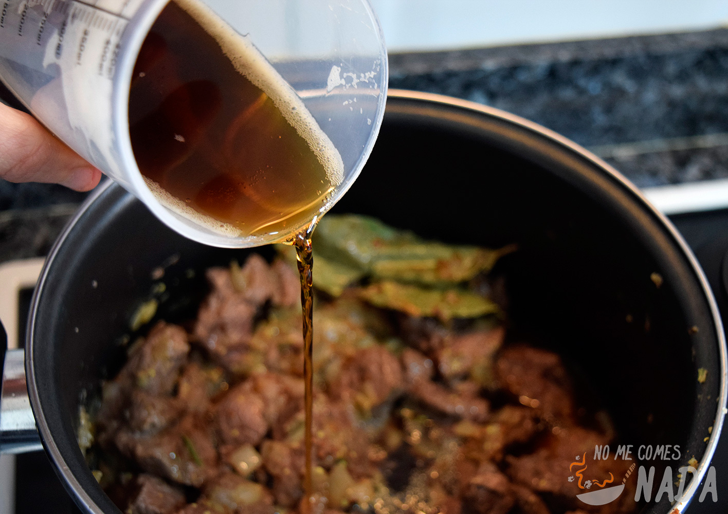 Devolvemos la carne a la cazuela junto con la cerveza, el laurel y el tomillo. En caso de ser necesario, añadimos agua o caldo hasta cubrir la carne un par de dedos. Dejamos cocinar a fuego lento, removiendo de vez en cuando, hasta que la carne esté totalmente tierna.