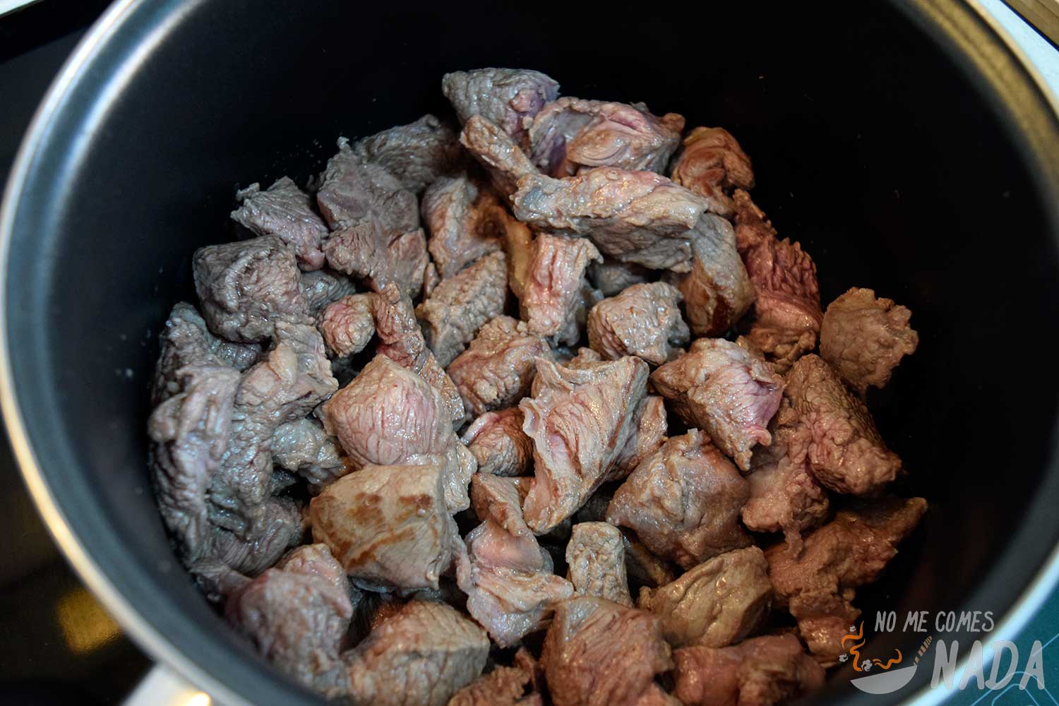 Echamos un chorro generoso de aceite de oliva en una olla grande y la ponemos a fuego alto. Agregamos la carne y la cocinamos lo justo para sellarla. Retiramos de la olla y reservamos.