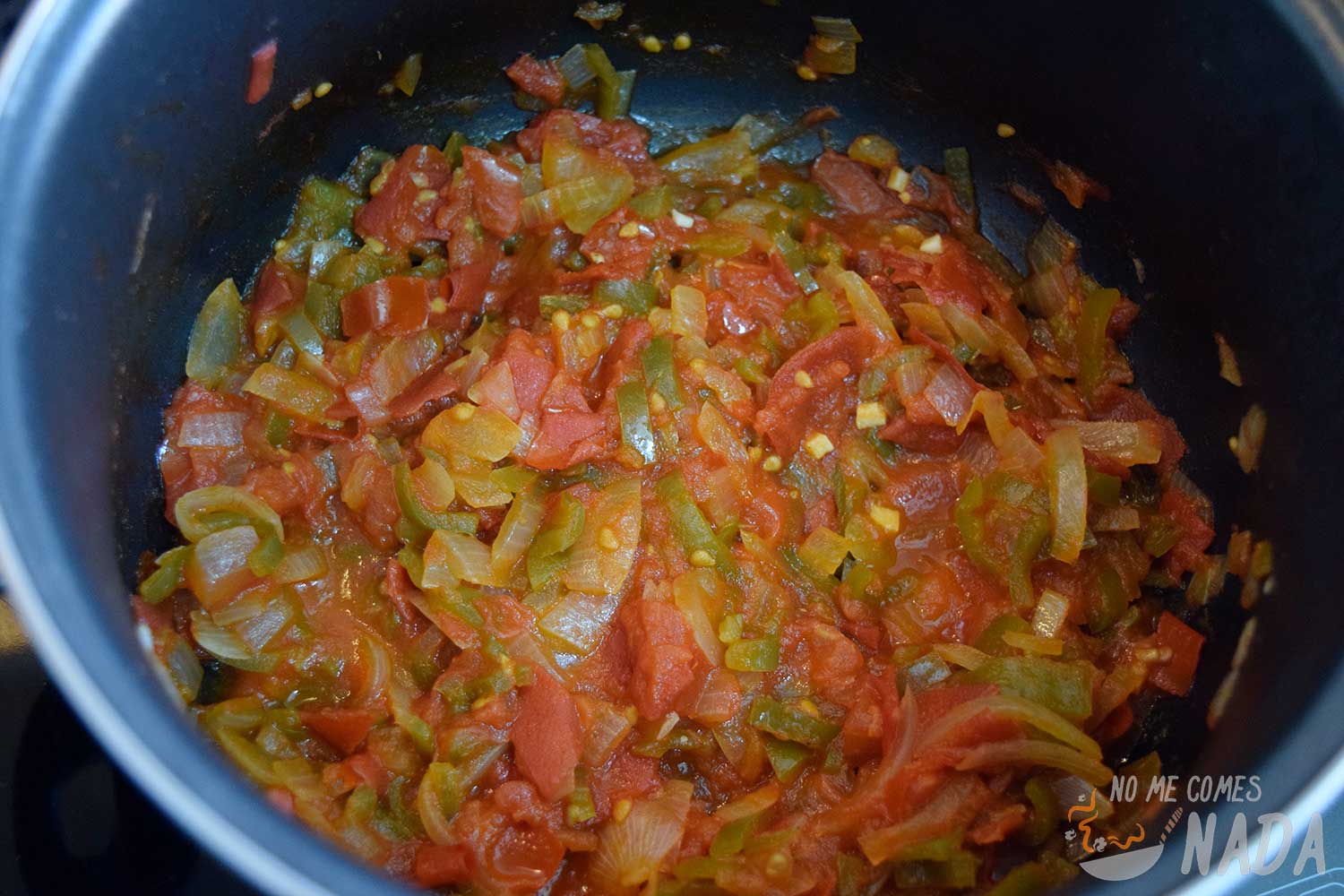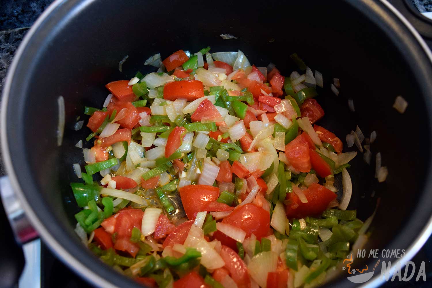 Bajamos el fuego a medio-bajo y añadimos las verduras picadas (cebolla, pimientos, tomates y ajo). Echamos una pizca de sal, tapamos la olla y dejamos pochar las verduras durante unos 20 minutos aproximadamente, removiendo de vez en cuando. Si queréis que el tomate se haga más rápido, podéis rallarlo en vez de trocearlo.