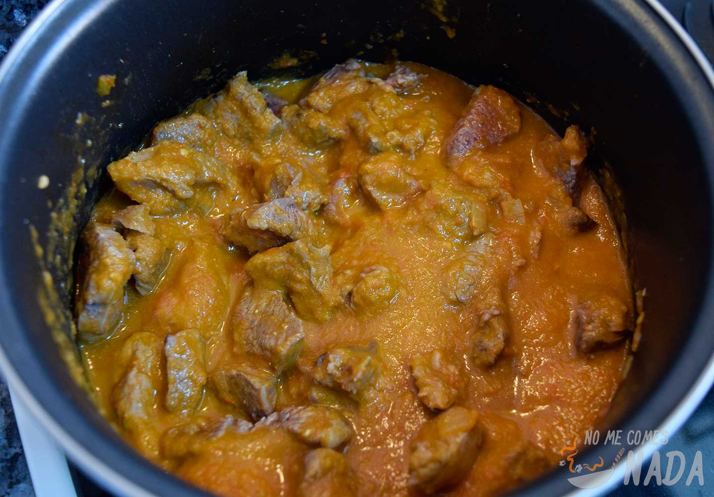 Dejamos cocer la carne a fuego medio hasta que la carne esté bien blanda, revisando de vez en cuando para evitar quedarnos sin caldo, añadiendo más en caso de ser necesario. El tiempo de cocinado dependerá de la parte de la ternera que utilicéis para hacer esta carne en salsa. En mi caso tuve la carne un total de 50 minutos.