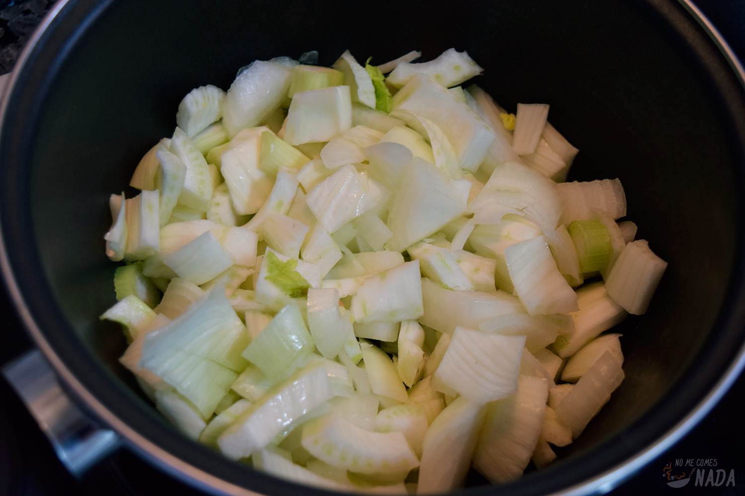 Pelamos todas las verduras y las troceamos gruesamente. Ponemos una cazuela a fuego medio con un chorrito de aceite de oliva virgen extra. Cuando coja temperatura, añadimos las verduras troceadas y salteamos unos minutos, veremos como el hinojo empieza a desprender su olor tan característico.