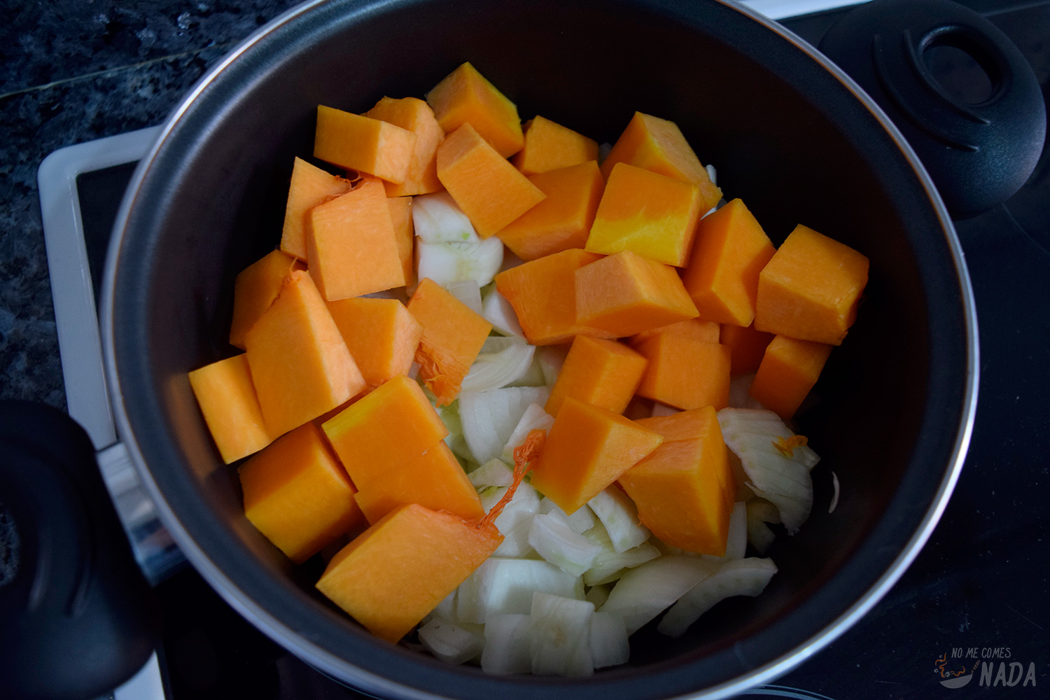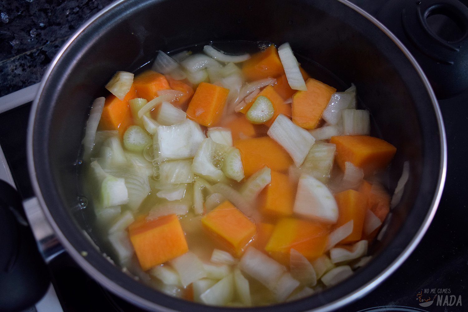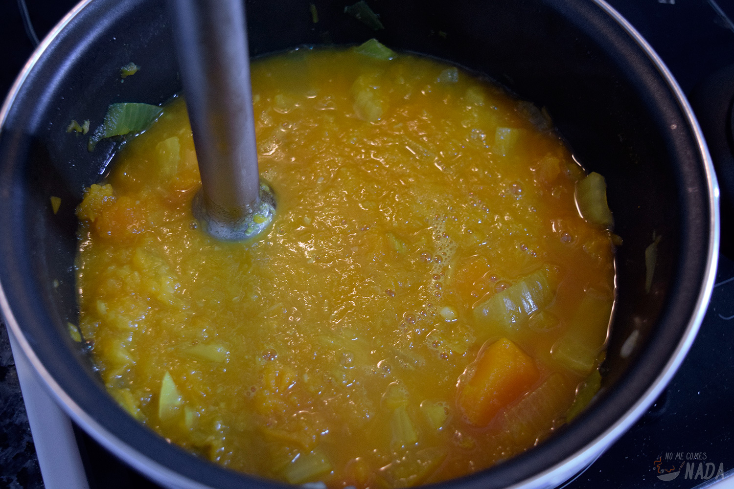 Si queréis darle un toque picante a esta crema de calabaza, hinojo y cúrcuma, podéis añadir en este momento un poco de jengibre fresco. Con un trocito del tamaño de un diente de ajo será más que suficiente.