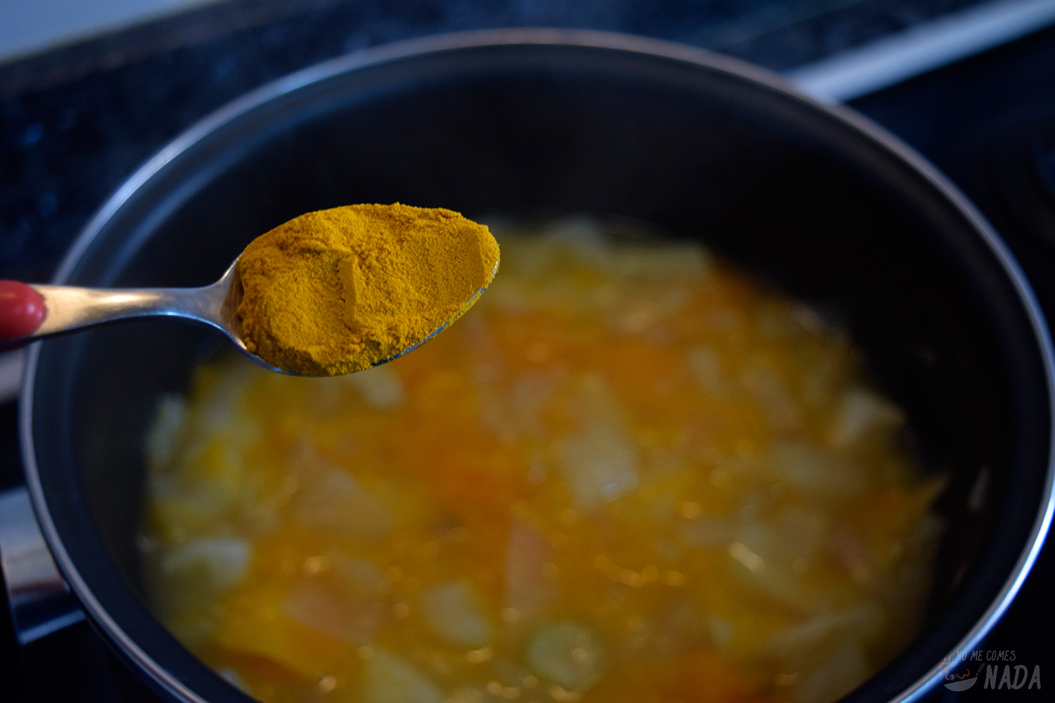 Cuando estén listas las verduras, añadimos una cucharadita de cúrcuma y las trituramos con la batidora o bien pasándolas por un pasapurés para obtener una crema con una textura más fina.