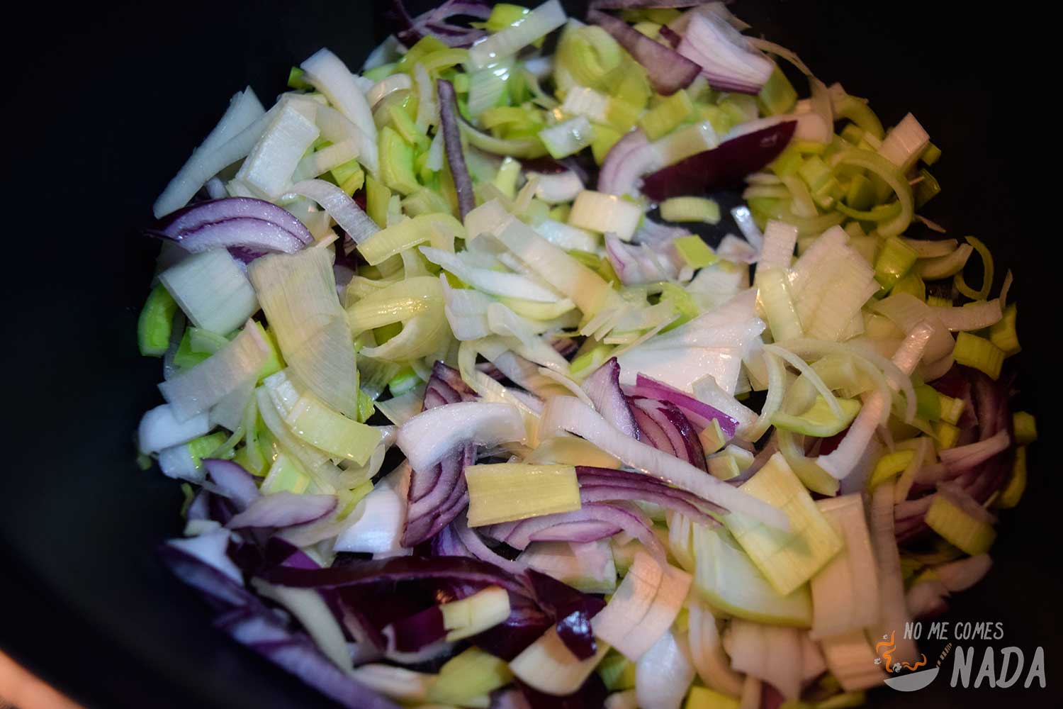 Empezamos quitándole al puerro la parte verde y las raíces de la parte inferior. Le quitamos también la primera capa y cortamos verticalmente en forma de cruz (casi hasta la mitad del puerro) para poder meterlo debajo del grifo y enjuagarlo bien para quitarle la arena que pueda traer. Pelamos la cebolla y picamos finamente junto con el puerro.