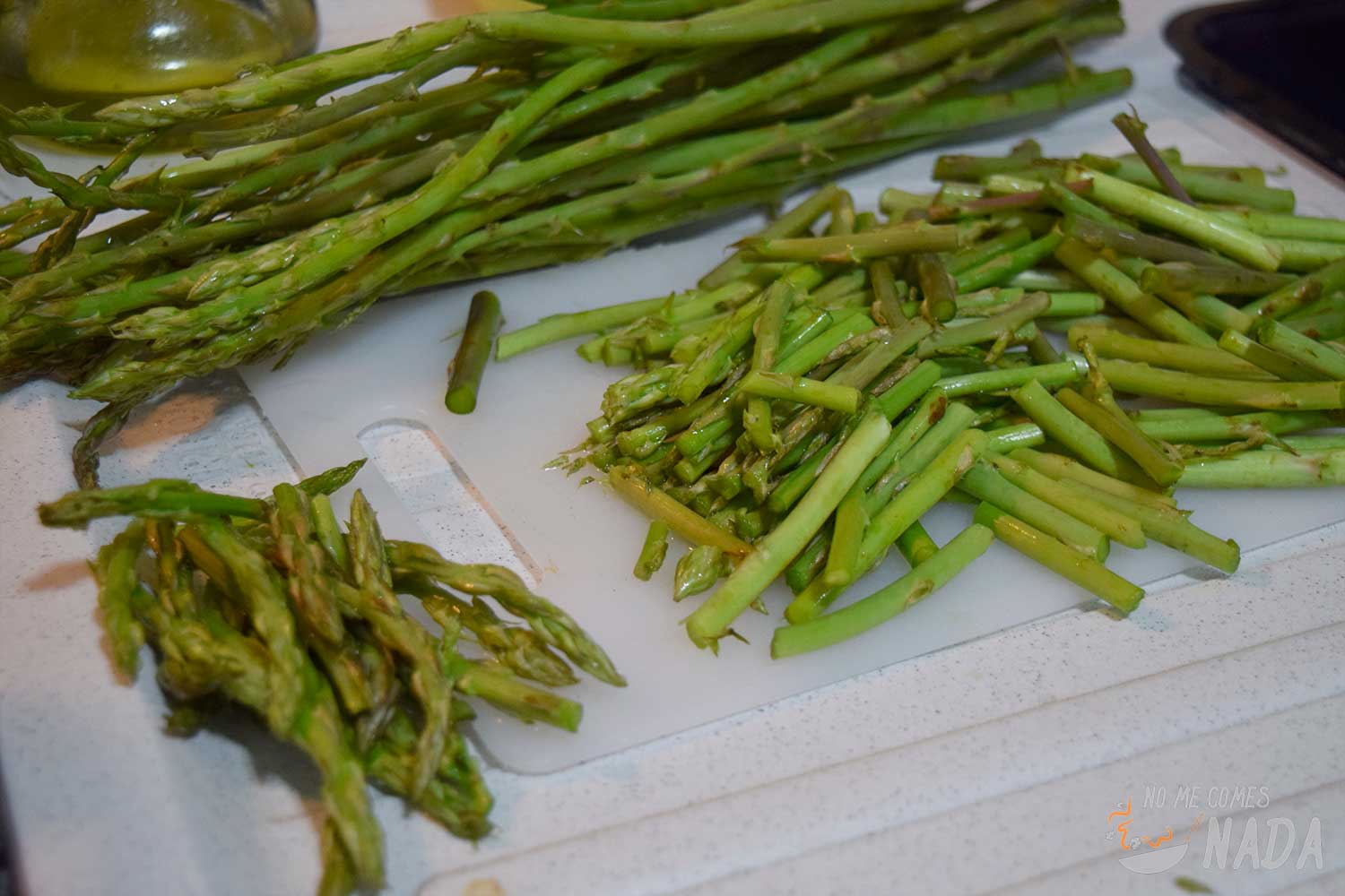 Mientras, vamos cortando los espárragos verdes. Trocearemos desechando la parte más dura de abajo y reservando algunas de las puntas de los espárragos (nos servirán para darle el toque final). Pelamos y troceamos la patata en cachelos no muy grandes (para que se cueza más rápido).