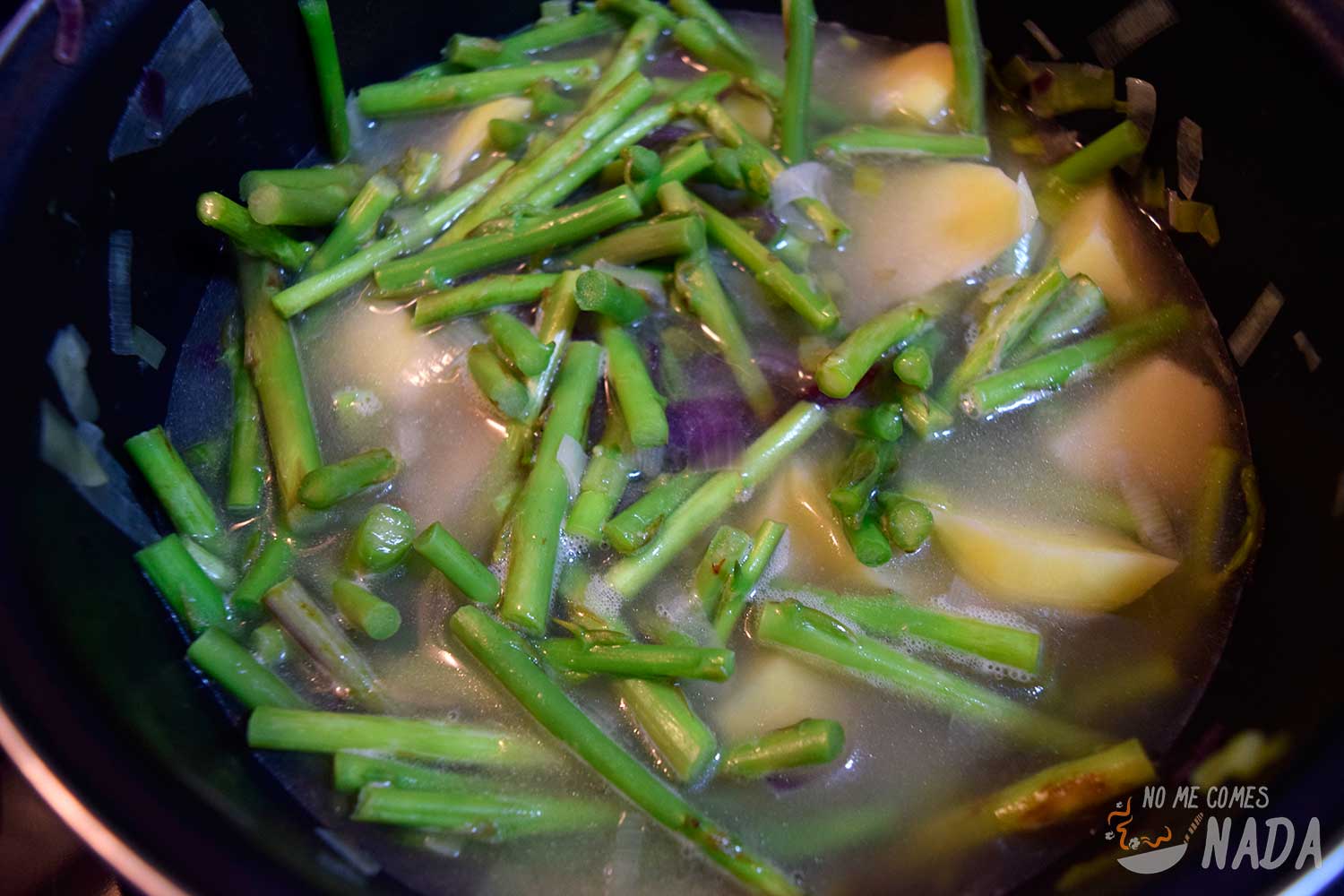 Cuando las verduras estén blandas, incorporamos los espárragos troceados y la patata y salteamos unos minutos. Vertemos la nata y añadimos agua hasta cubrir todas las verduras. Tapamos la olla, subimos el fuego y dejamos hervir unos 8-10 minutos, removiendo de vez en cuando y vigilando que no se quede sin líquido (en ese caso echamos un poco más de agua).