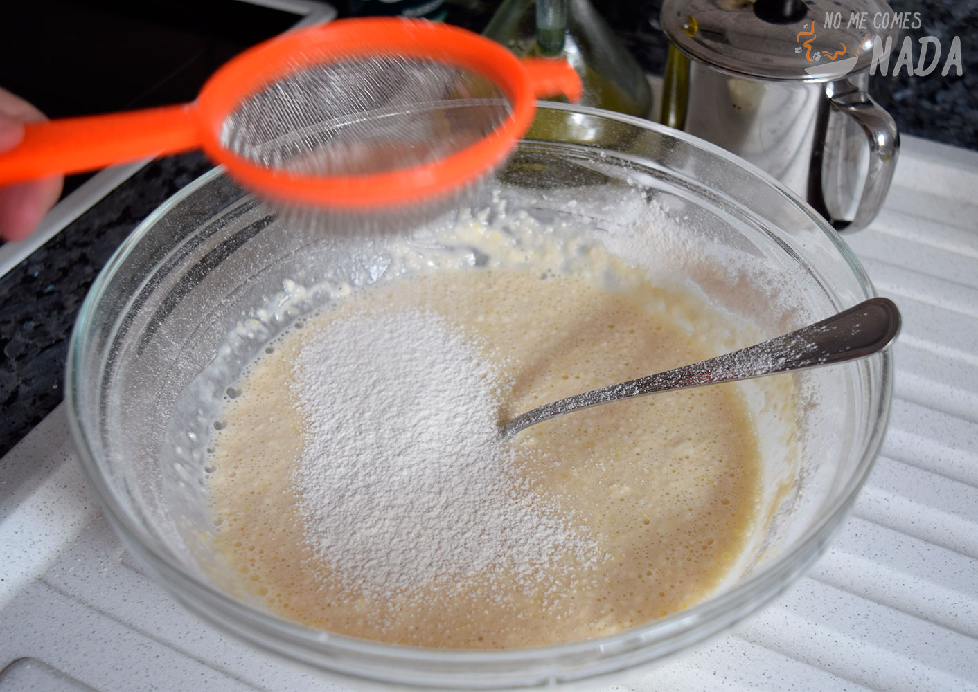 Luego, tamizamos la harina y la vamos echando poco a poco, batiendo constantemente para intentar que no se nos formen grumos. Si después de echar toda la harina vemos que hay grumos en la mezcla, podemos batir todo con la batidora para obtener una mezcla completamente homogénea.