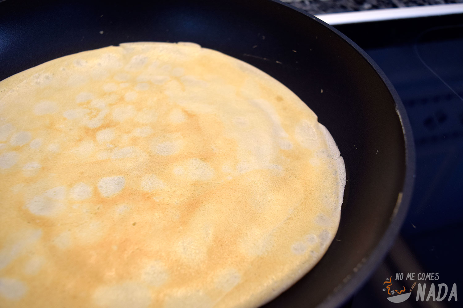 Ponemos una sartén al fuego con unas gotas de aceite de oliva virgen extra y, cuando esté bien caliente, añadimos la masa con ayuda de un cucharón. Tenemos que cubrir todo el fondo de la sartén con una fina capa de masa, no queremos que nos quede muy gordo, en plan tortita americana, las crepes son finas. Cuando veamos que los bordes empiezan a levantarse y despegarse del fondo será el momento de darle la vuelta.