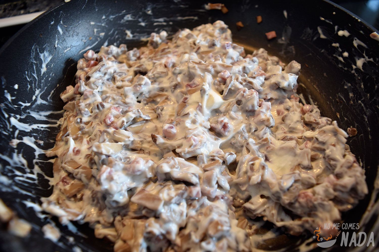 Troceamos unos 100 g de champiñones y los salteamos en una sartén con unas gotas de aceite. Incorporamos el bacón picado y lo dejamos hasta que esté dorado. Por último, incorporamos queso crema al gusto hasta obtener una mezcla bien cremosa.