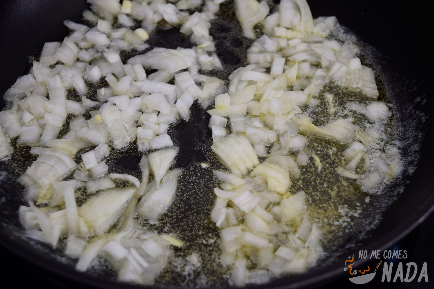 Ponemos la mantequilla en una sartén grande, a fuego medio y, cuando esté derretida y caliente, añadimos la cebolla muy picadita. Pochamos la cebolla hasta que esté blanda y empiece a transparentar.