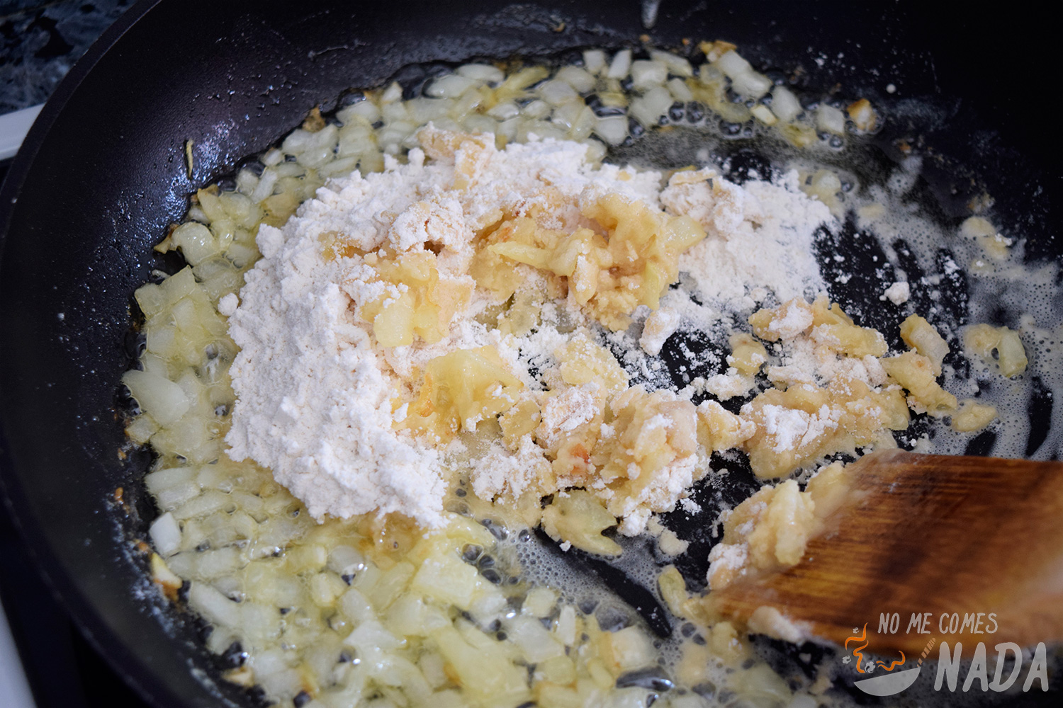 Añadimos la harina a la sartén y dejamos unos minutos, removiendo un poco, para que se tueste y pierda el sabor a crudo. Añadimos el caldo poco a poco, mezclando cada vez para que se integre totalmente con la harina. De esta manera, conseguiremos que la bechamel no forme grumos, porque los iremos diluyendo poco a poco. Aún así, si os queda una bechamel con grumos, no hay problema por pasarla por la batidora (aunque trituréis la cebolla).
