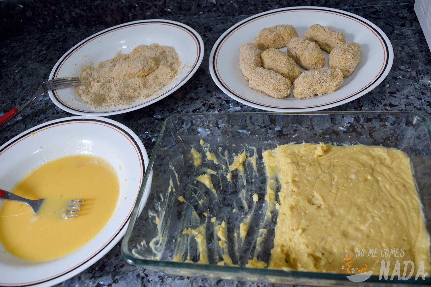Sacamos la masa de la nevera cuando vayamos a hacer las croquetas de pincho moruno, no hace falta sacarla antes. Formar las croquetas no tienen ninguna complicación: cogemos porciones (del tamaño que queráis) con las manos ligeramente aceitadas para evitar que se nos pegue la masa, formamos la croqueta (tradicional alargada, redonda o como se os ocurra) y la pasamos por huevo batido y pan rallado.