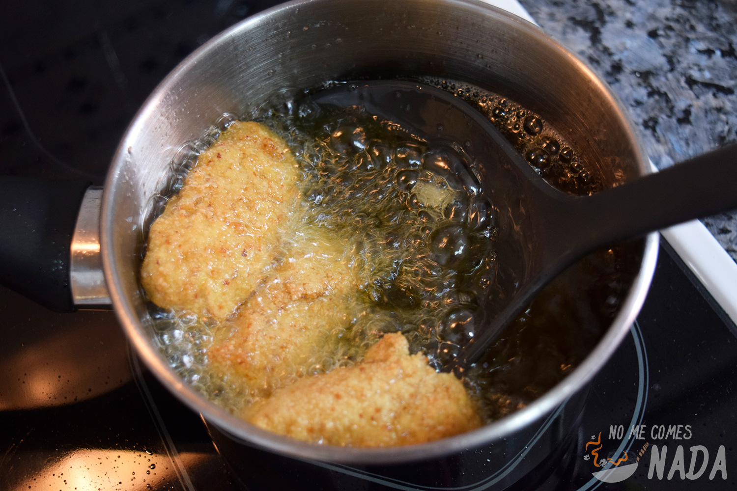 Una vez que tenemos todas las croquetas rebozadas, pasaremos a freírlas. Otro paso sencillo, simplemente necesitamos una sartén/cazo/freidora con abundante aceite y freírlas cuando esté bien caliente. La única dificultad de este paso es que no se nos quemen las croquetas, se deshagan o se nos queden crudas por dentro. Pero eso se consigue con la práctica