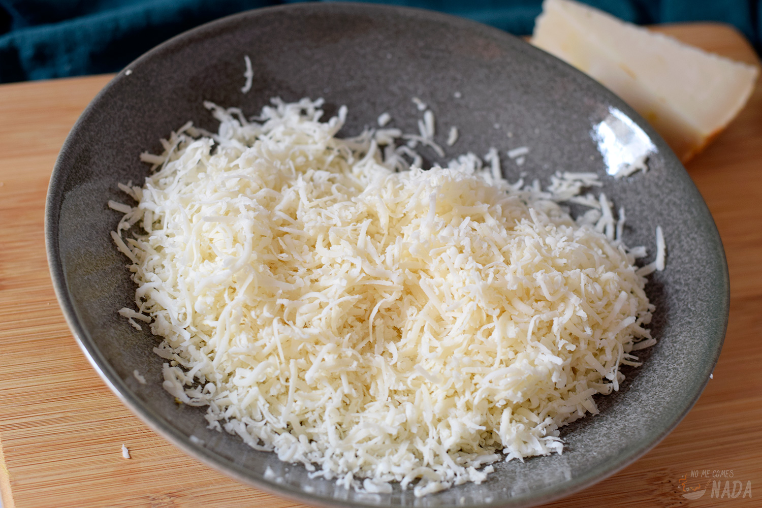 Lo primero será rallar el queso curado para que lo tengamos listo cuando nos pongamos a preparar la bechamel de la masa. Os recomiendo que uséis un queso potente, para que el sabor esté bien presente en la masa, que se note que son croquetas de queso y nueces. En mi caso, he usado un queso de cabra madurado.