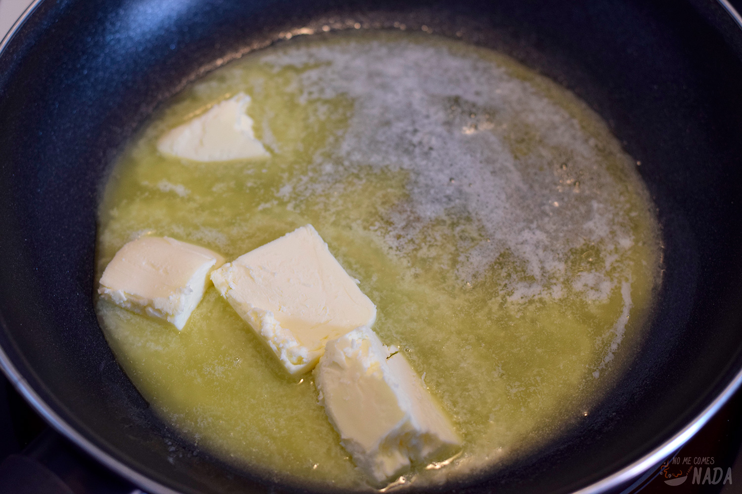 Derretimos la mantequilla en una sartén a fuego medio y, cuando lo esté, añadimos la harina. Removemos y dejamos que se haga/tueste durante un par de minutos. Con eso conseguiremos que luego las croquetas no sepan a harina cruda.