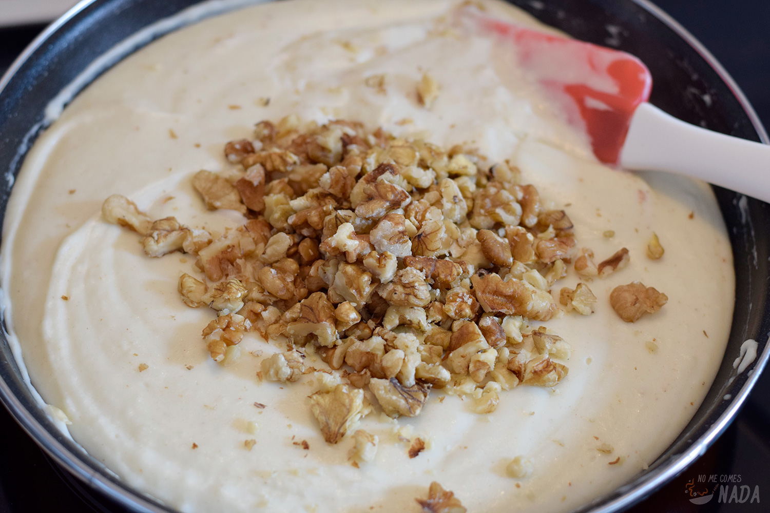 Dicho esto e integrada toda la leche en la masa, incorporamos el queso rallado, las nueces troceadas y un poquito de nuez moscada. Removemos hasta integrar todos los ingredientes en la masa.