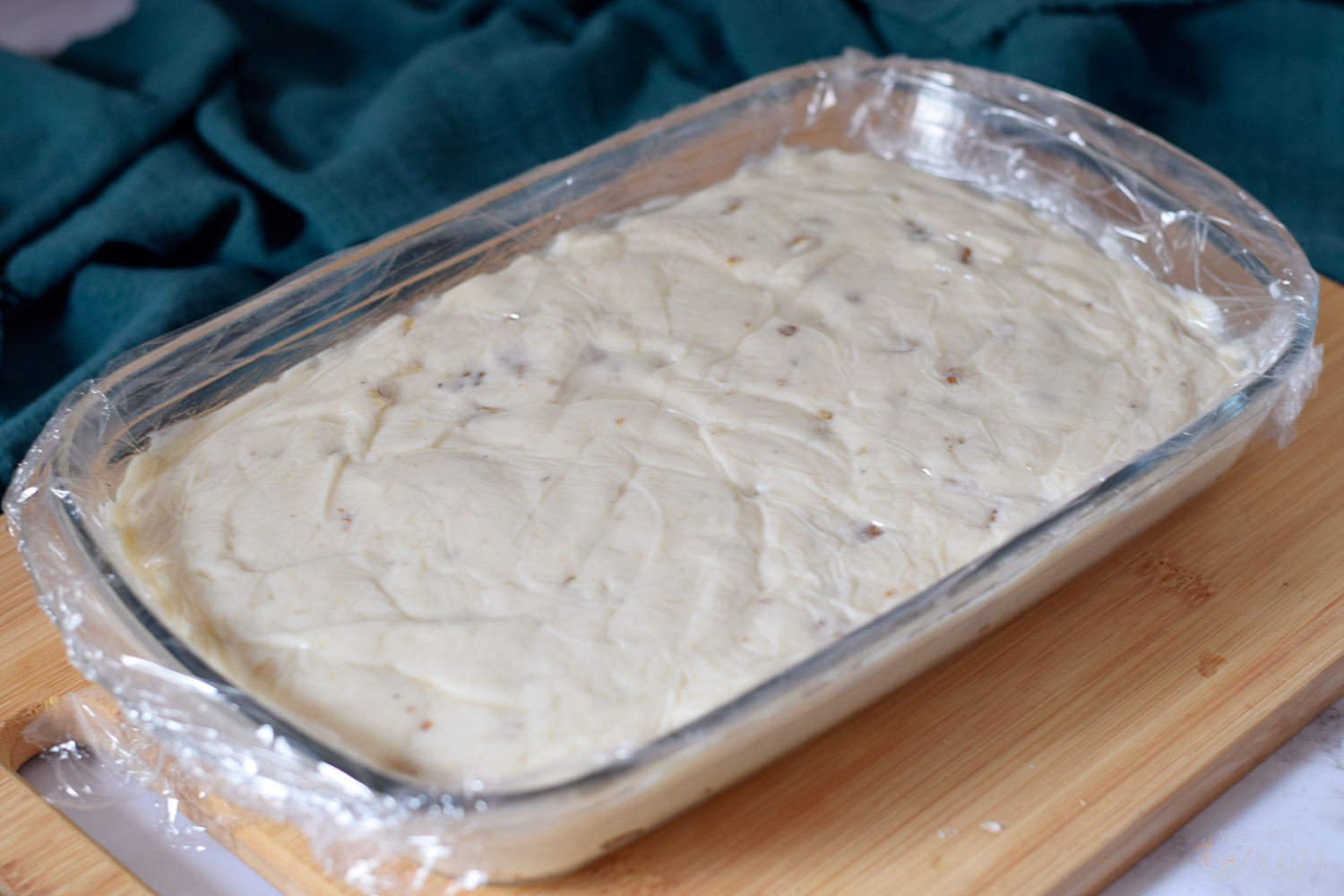 Vertemos la masa de las croquetas de queso y nueces en un recipiente, untado ligeramente con aceite. Cubrimos con film “a piel”, es decir, pegando el film a la masa para evitar que se forme costra. Cuando la masa se haya enfriado la metemos en la nevera hasta el día siguiente.