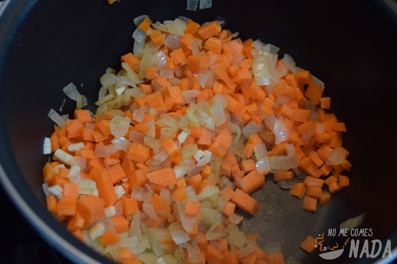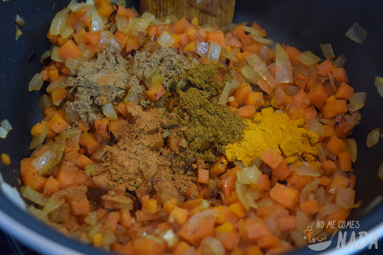 Pelamos y picamos finamente tanto la cebolla como las zanahorias. Ponemos una olla a fuego medio-bajo con un chorrito de aceite de oliva virgen extra y añadimos las verduras. Dejamos pochar a fuego lento. Cuando estén blandas, añadimos las especias (currys, garam masala y chile) y removemos para que se impregnen bien.