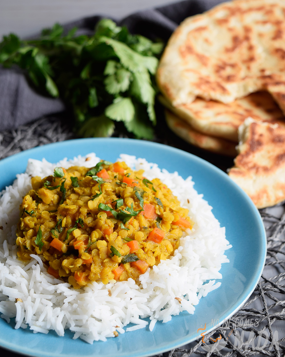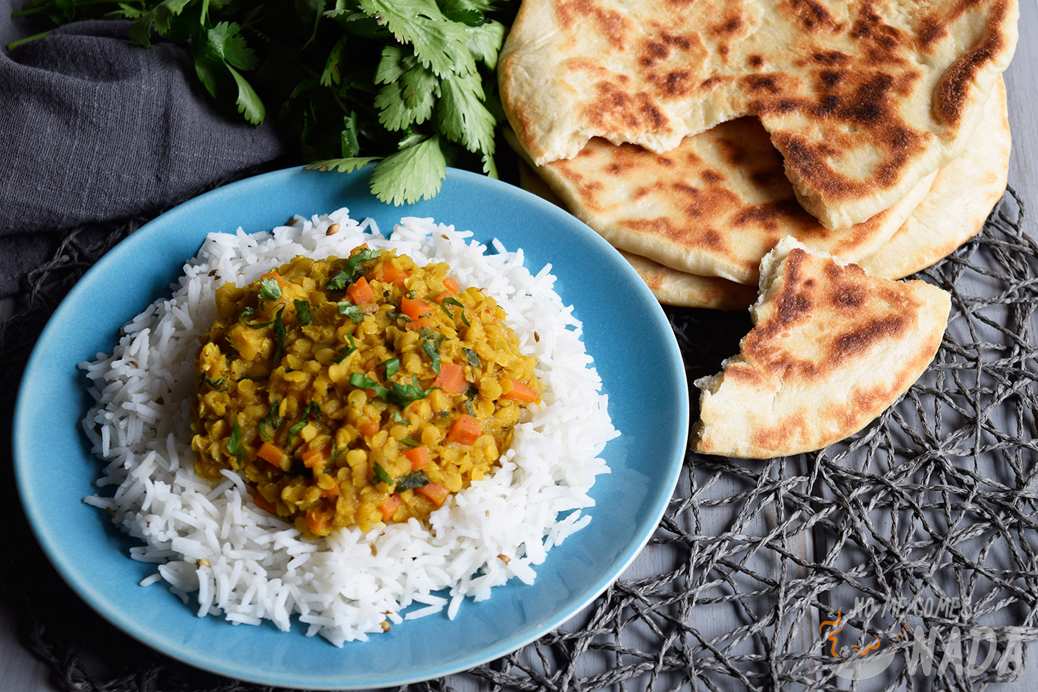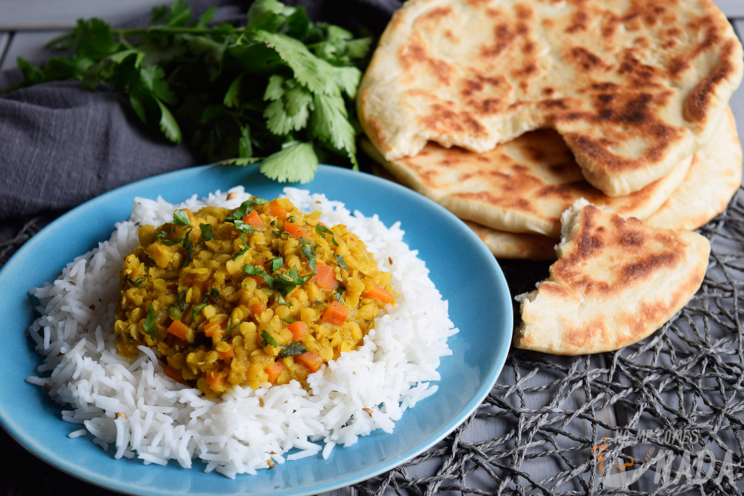 Servimos el dhal de lentejas acompañado de arroz basmati (las raciones indicadas están contadas para servir con arroz) y pan naan para tener una comida india de lo más completa.