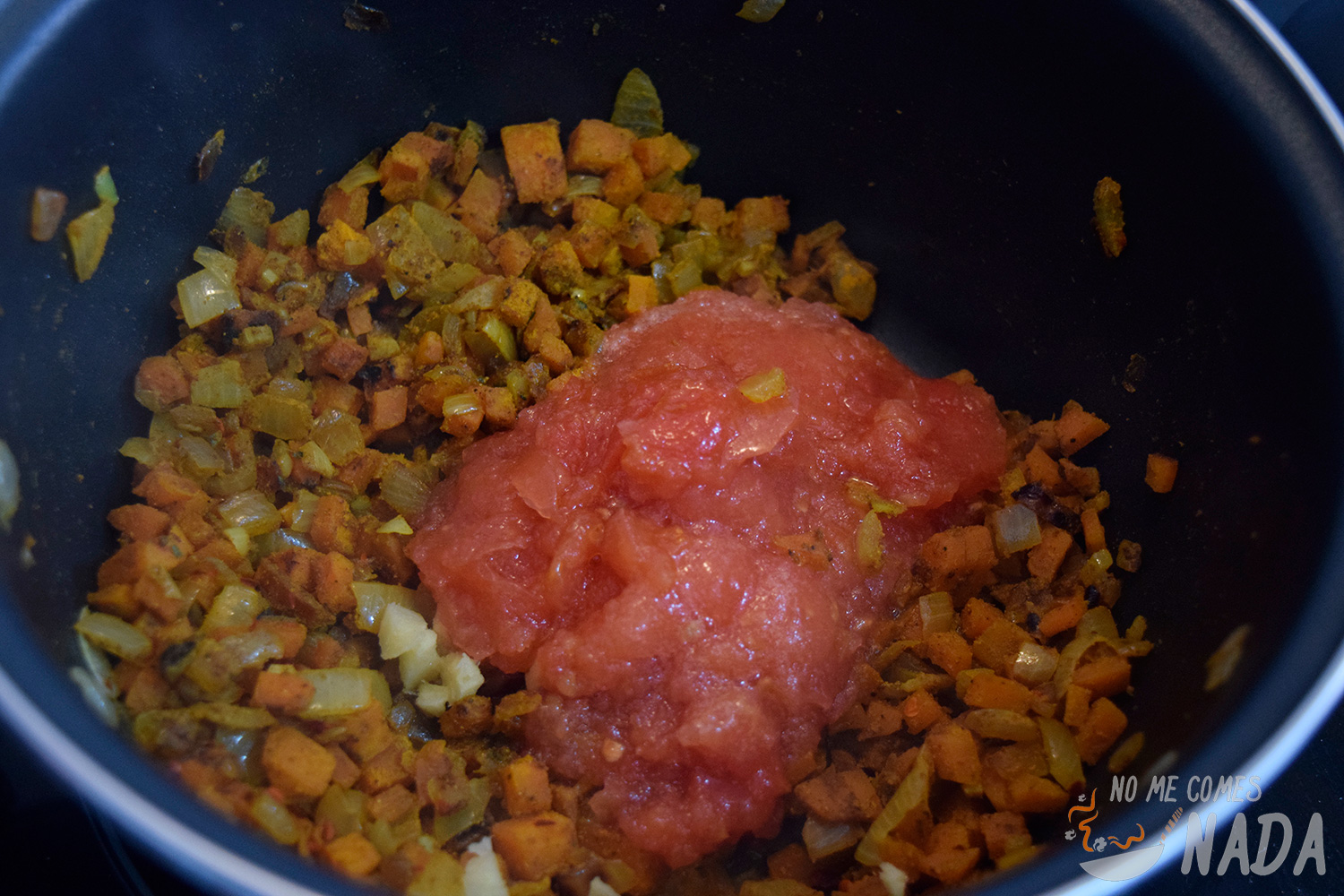 Para este tipo de guisos, yo suelo rallar los tomates, pero podéis triturarlos también para mayor comodidad o, incluso, añadirlos muy picaditos (aunque de esta forma tendréis que cocinarlos algo más de tiempo para que se hagan bien). Añadimos los tomates rallados a la olla junto con el jengibre fresco rallado y el diente de ajo muy picado. Dejamos unos minutos para que el tomate pierda toda el agua que trae.