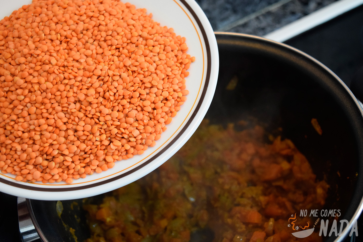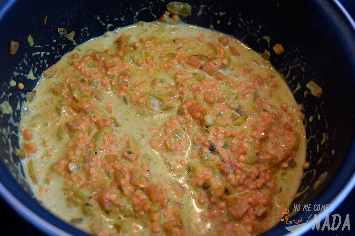 Añadimos las lentejas a la olla y removemos para que se impregnen bien de los sabores. Agregamos la leche de coco y completamos con agua hasta cubrir completamente las lentejas. Dejamos cocer el dhal de lentejas hasta que éstas estén blandas. Si ponéis las lentejas en remojo previamente, tardarán menos en cocerse. Removed de vez en cuando para que no se peguen al fondo de la olla y, si es necesario, id añadiendo agua durante la cocción para que no se queden secas.