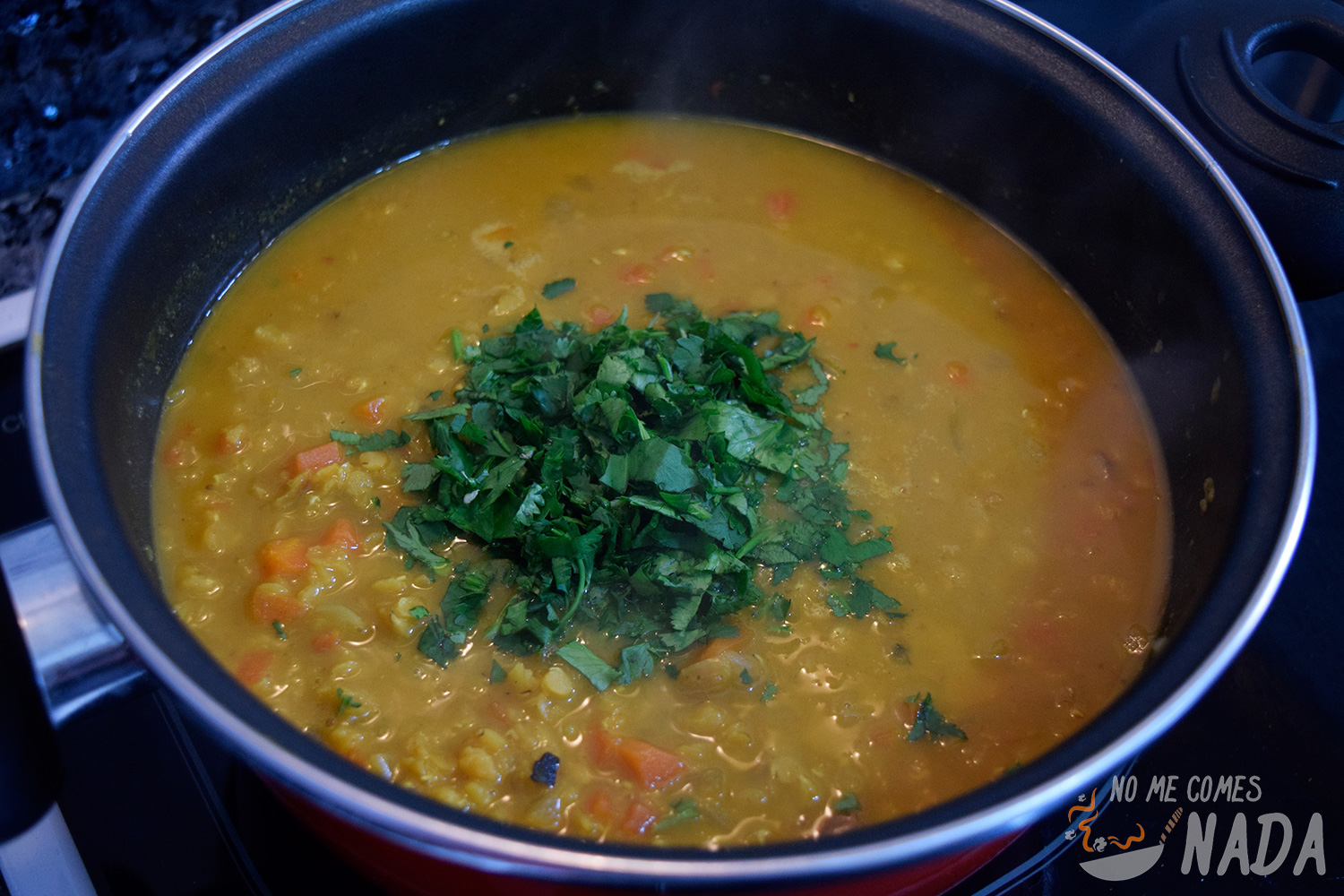 Cuando las lentejas estén listas, añadimos cilantro fresco picado finamente para darle el toque final.