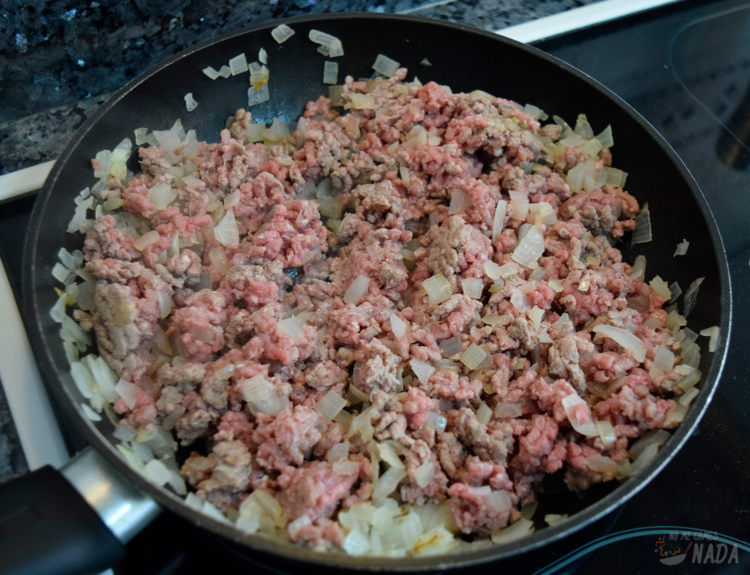 Pelamos la cebolla y la cortamos muy fina. La ponemos en una sartén a fuego medio-bajo con un chorrito de aceite de oliva y dejamos que se poche lentamente. Cuando empiece a ablandarse y transparentar, añadimos la carne y subimos un poco el fuego. Salteamos hasta que la carne esté hecha.