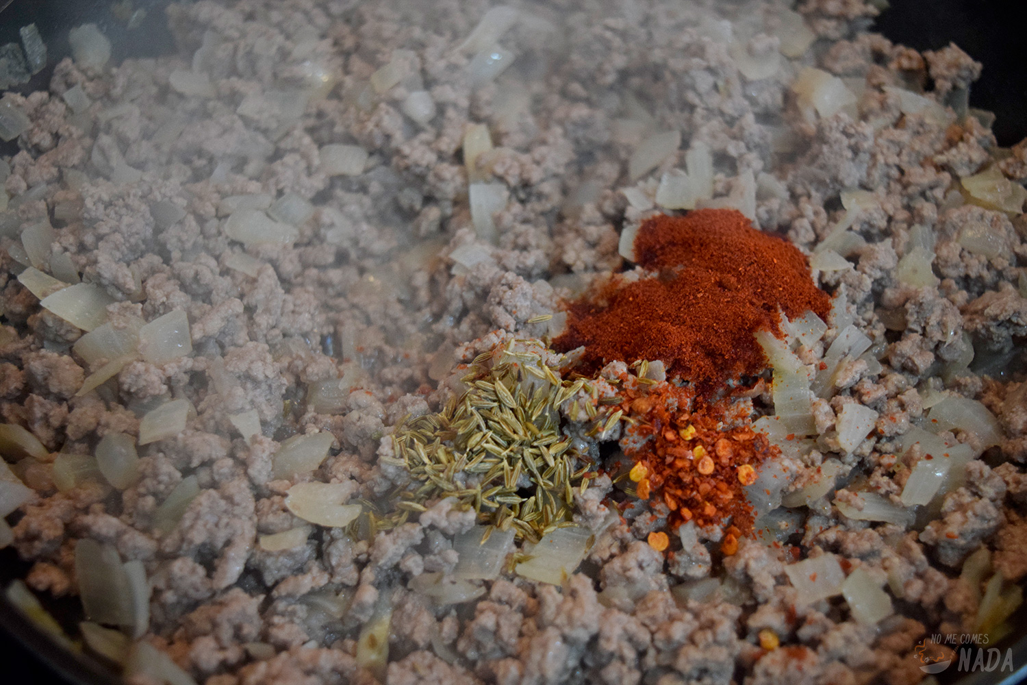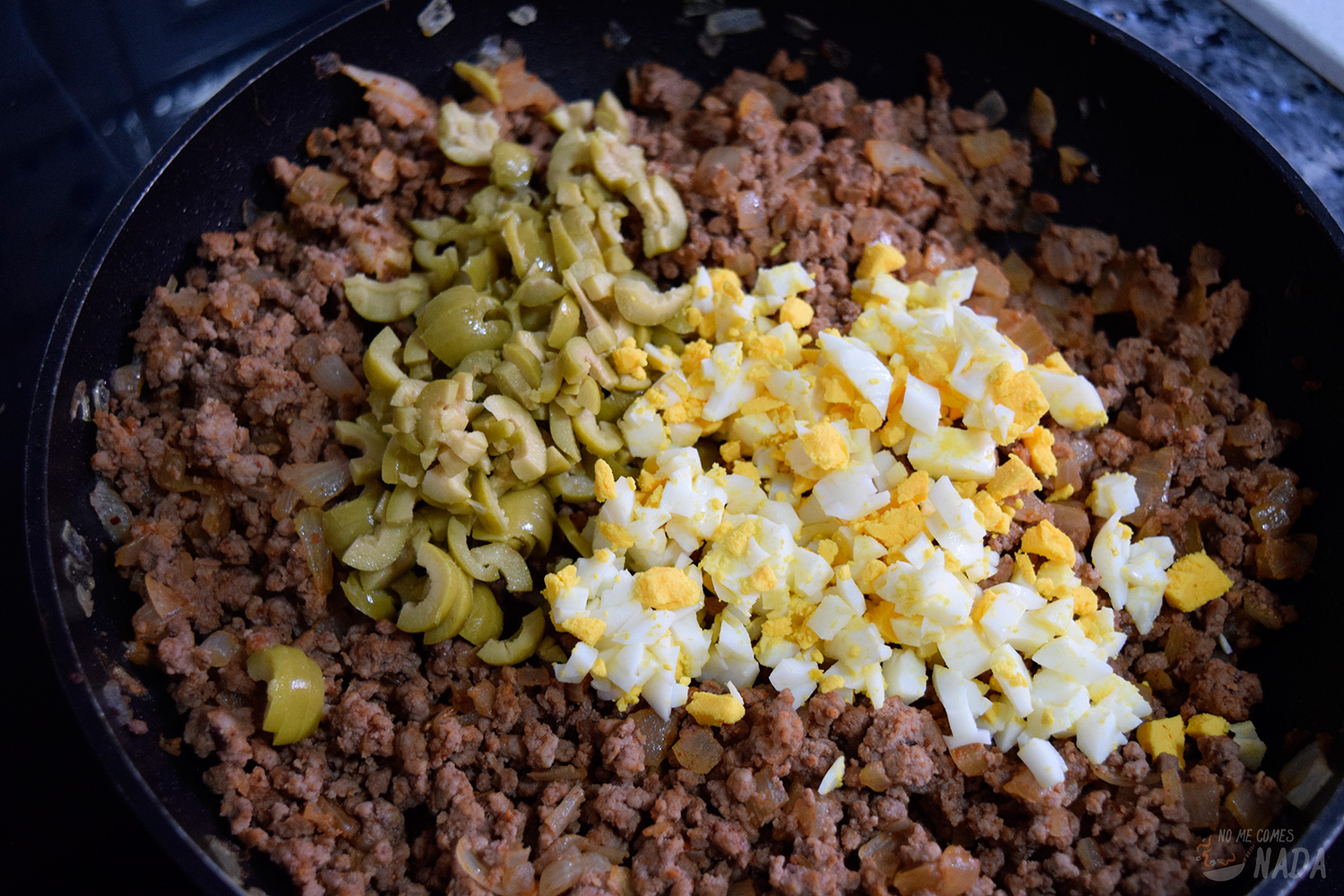 Agregamos las especias a la sartén, removemos para que se mezclen y salteamos un par de minutos más para que la carne coja sabor. Retiramos del fuego y añadimos las aceitunas y el huevo duro picados. Mezclamos para que se repartan.