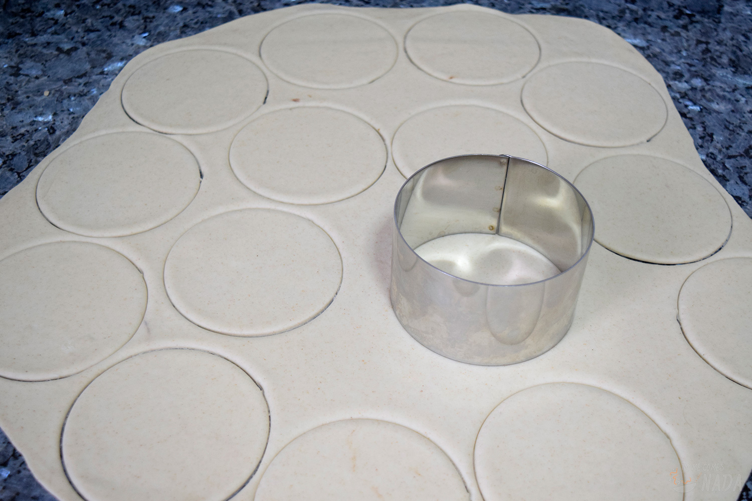 Ahora toda cortar la masa para sacar las obleas de nuestras empanadas argentinas. Para ello, estiramos la masa con un rodillo hasta que esté muy fina. Creo que todos conocemos el grosor de las obleas comerciales, pues esa será nuestra referencia. Cortamos círculos con cualquier instrumento que tengamos por casa. Yo me ayudé con un aro de emplatar de 10 cm, pero sirve igualmente un vaso, por ejemplo.