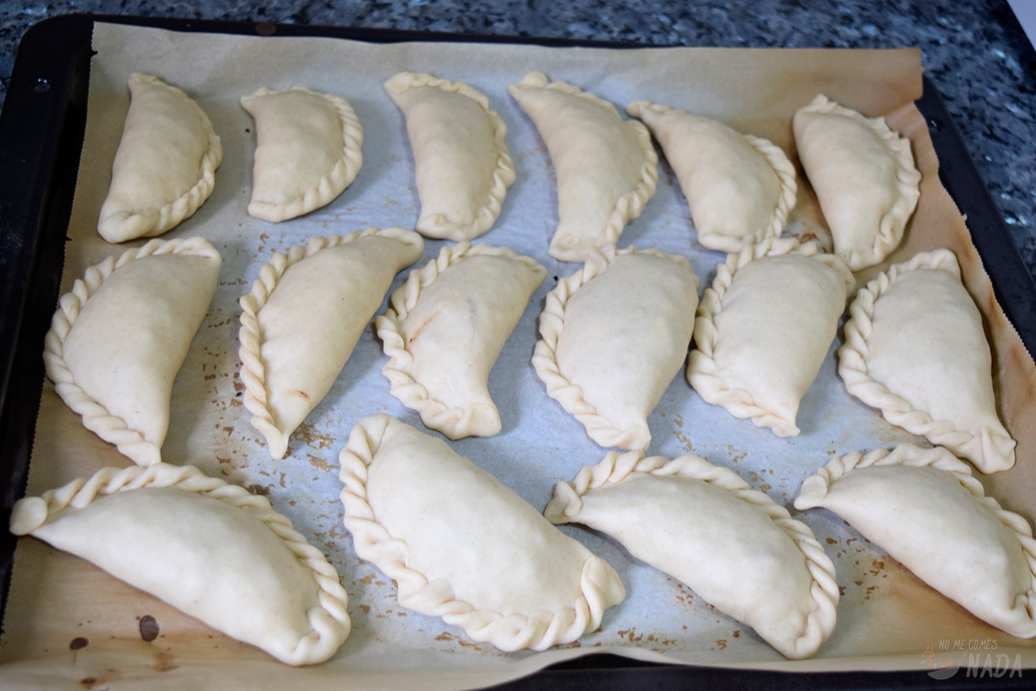 Colocamos las empanadas en la bandeja del horno sobre papel vegetal y las metemos al horno precalentado a unos 200ºC el tiempo necesario para que empiecen a dorarse. Yo no las he pintado con huevo, pero podéis perfectamente si lo preferís, os quedarán más brillantes.