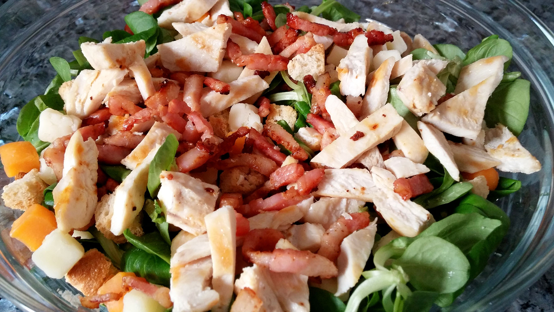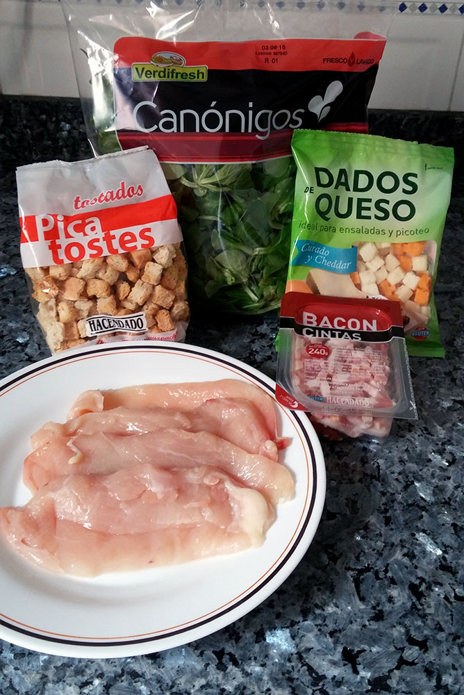 Cogemos un bol y echamos todos los ingredientes: canónigos, quesos, picatostes, bacón y pollo, que lo echaremos troceado. Ahora solo nos queda aderezar nuestra ensalada ![]()