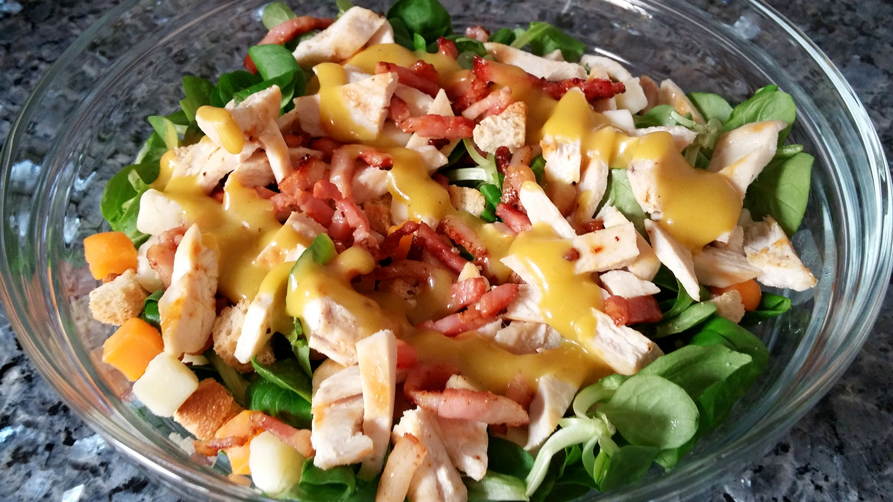 En el último viaje que hice con unos amigos, me comprometí con ellos a poner una receta con el aliño de una ensalada que probamos así que esta mañana me dije: de hoy no pasa que luego se me enfadan. Así que aquí os traigo una ensalada de pollo con aliño de mostaza y miel.
