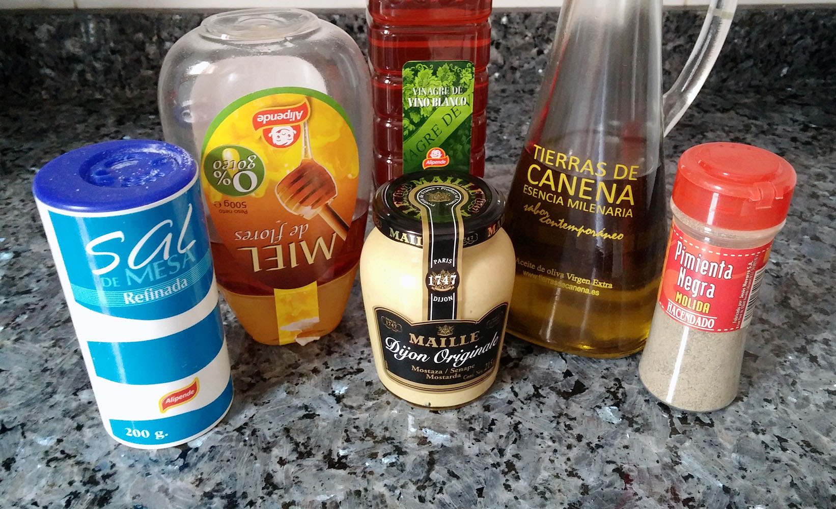Una vez tengamos el aliño os recomiendo probarlo porque si habéis echado un aceite más bien intenso, puede que el aliño sepa más a aceite que a mostaza y miel. Si necesitáis rectificar, no hay problema, echáis un poco más del ingrediente que necesitéis y volvéis a batir (ya no os hará falta tanta energía
