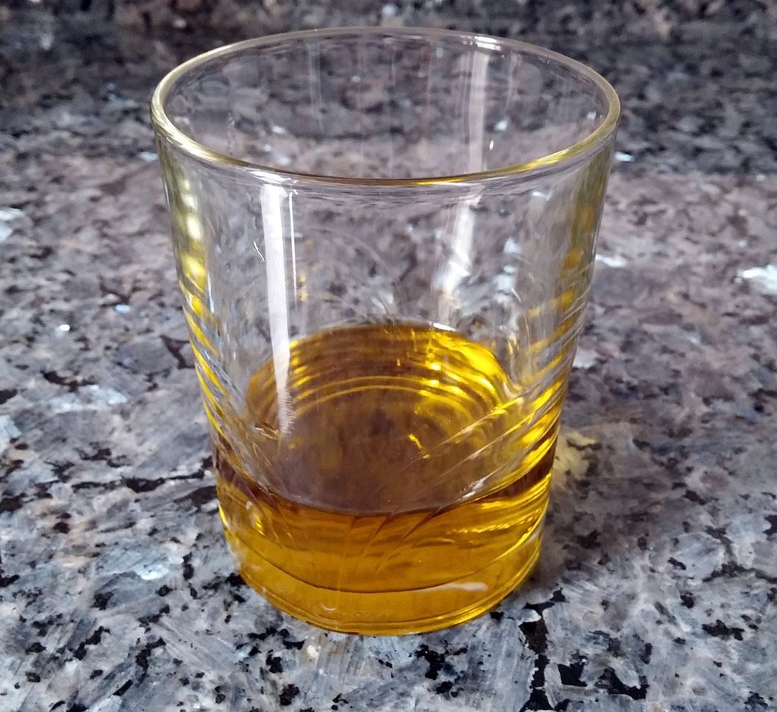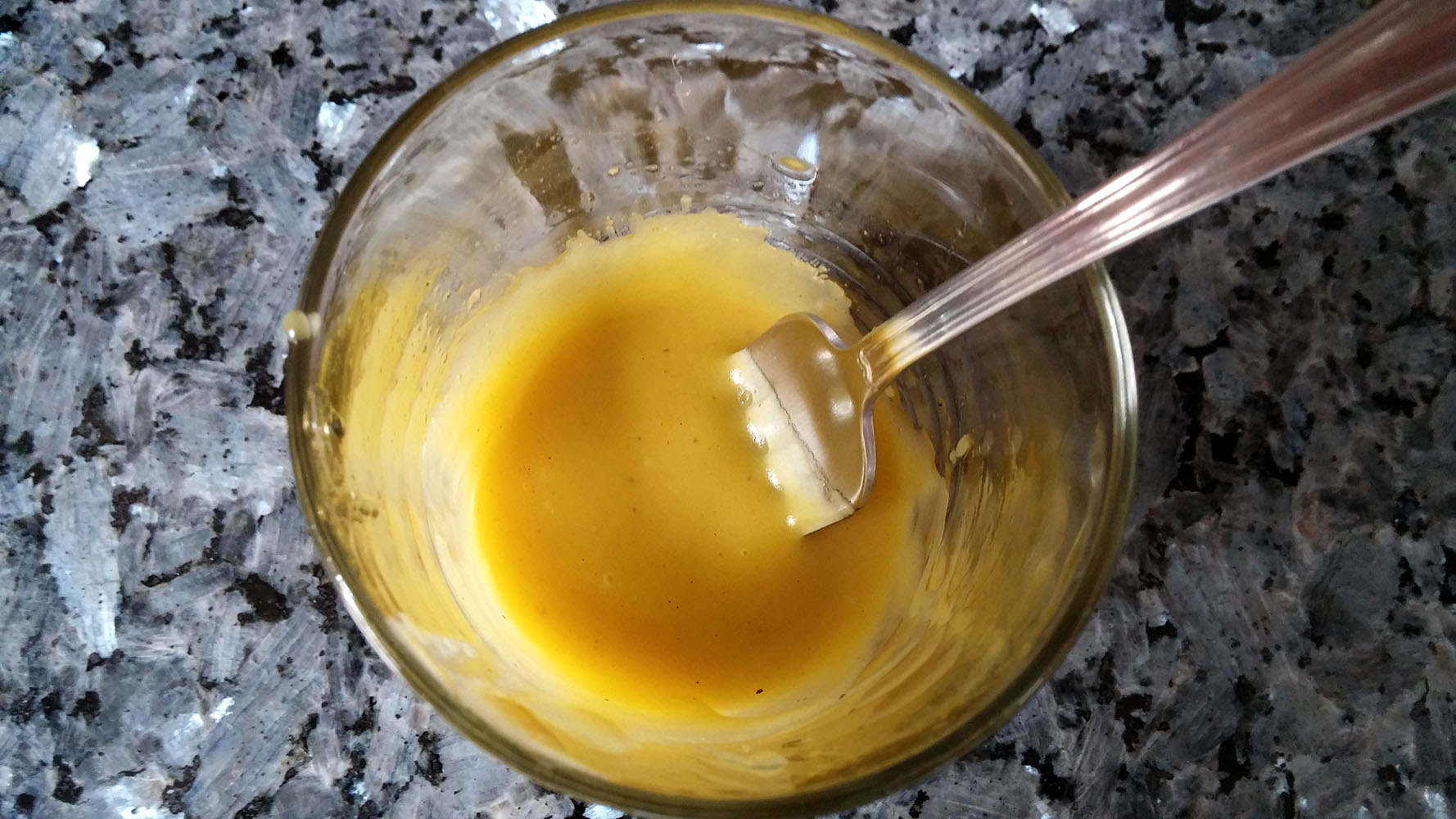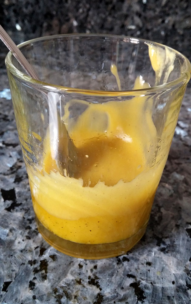 En esta ocasión vamos a echarle un aliño/salsa de mostaza y miel que está tanto de moda últimamente y que le dará un sabor dulzón. Llenamos ¼ de vaso con aceite de oliva virgen extra y echamos una cucharada de mostaza de Dijon, una cucharada de miel, un chorrito de vinagre, una pizca de sal y una pizca de pimienta. Ahora mismo tendrá un aspecto un poco raro, como si se nos hubiera cortado la salsa pero no preocuparos que en cuanto se mezcle quedará bien. Para ello, cogemos un tenedor y batimos enérgicamente para que emulsione bien y se nos quede todo mezclado con una textura de salsa suave. En las fotos podéis ver el detalle del antes y el después de batirlo para que os hagáis una idea de cómo tiene que quedar.