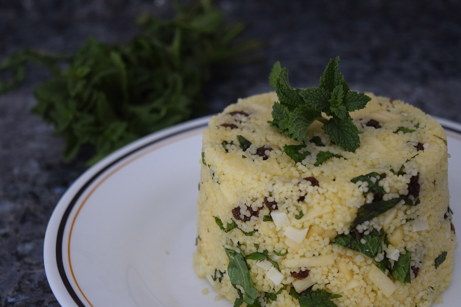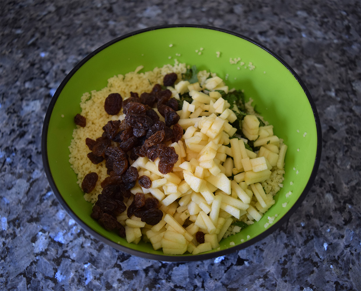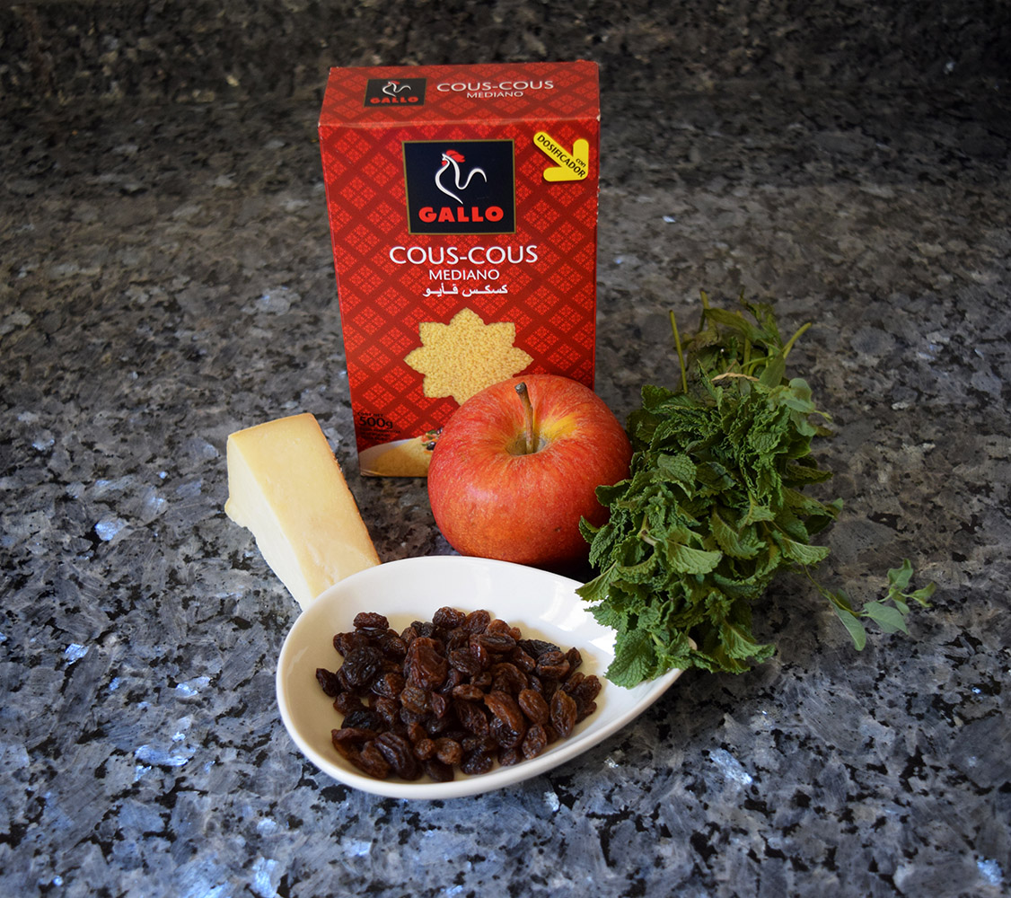 Cuando el cous-cous se haya enfriado lo mezclamos con todos los ingredientes: hierbabuena, manzana, queso y las pasas.