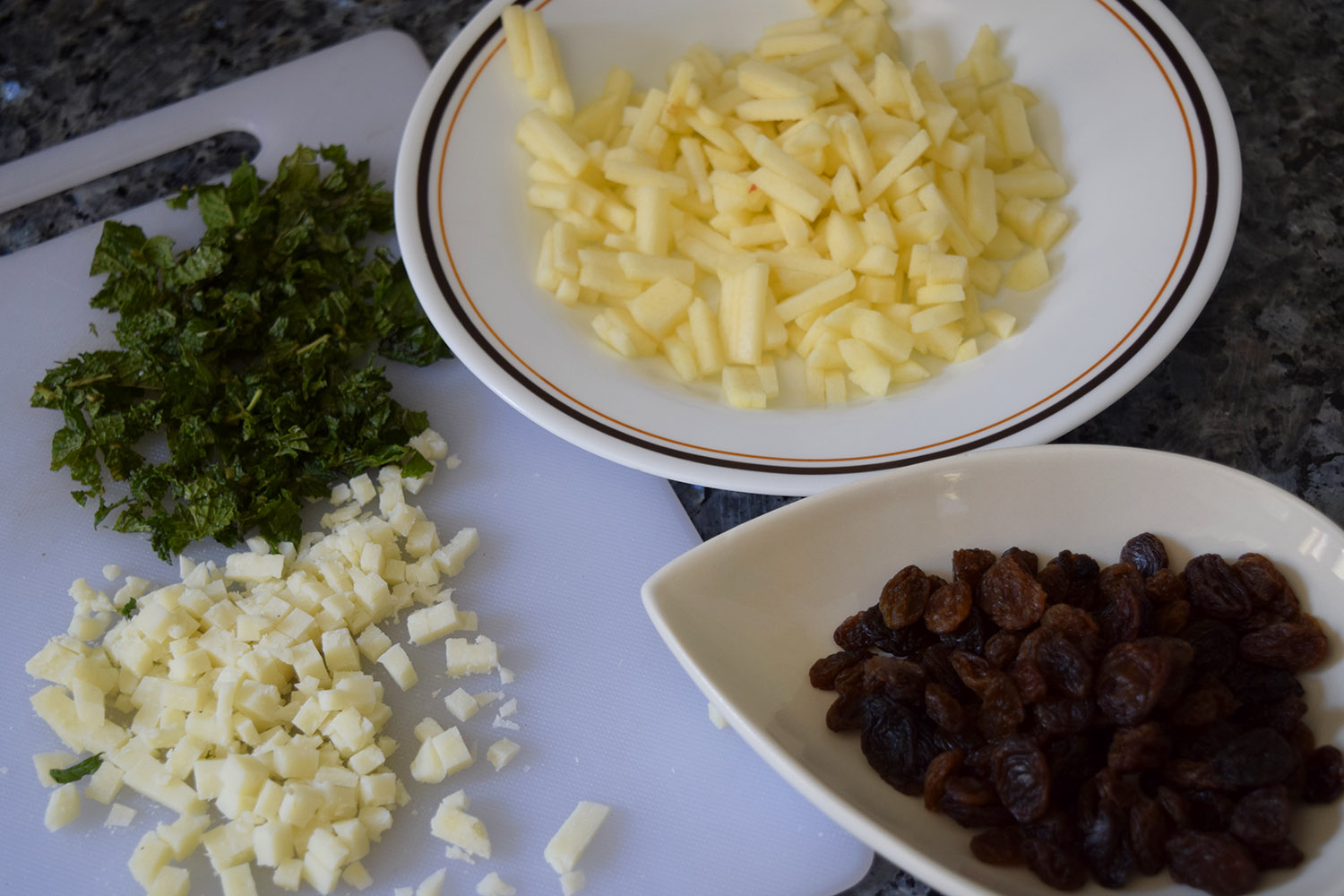 El resto de los ingredientes no requieren nada de preparación, simplemente picaremos muy bien la manzana, la hierbabuena y el queso. En mi caso he usado un queso curado para darle un sabor fuerte a la ensalada pero si preferís un queso tierno con un sabor más suave lo podéis usar sin problema.