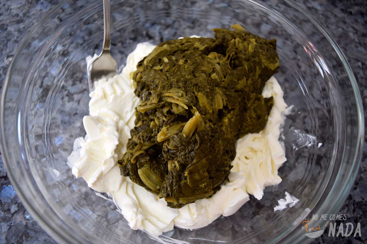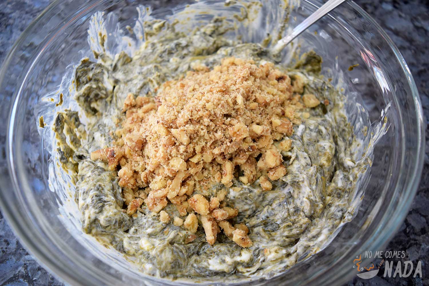 En un bol amplio ponemos el queso crema y las espinacas ya cocidas. Removemos hasta que todo esté mezclado, lo más homogéneamente posible. Por otro lado, machacaremos un poco las nueces para trocearlas (por ejemplo, con un mortero) y las incorporamos a la mezcla, removiendo de nuevo hasta que queden integradas completamente. Vertemos la mezcla en una manga pastelera y reservamos.