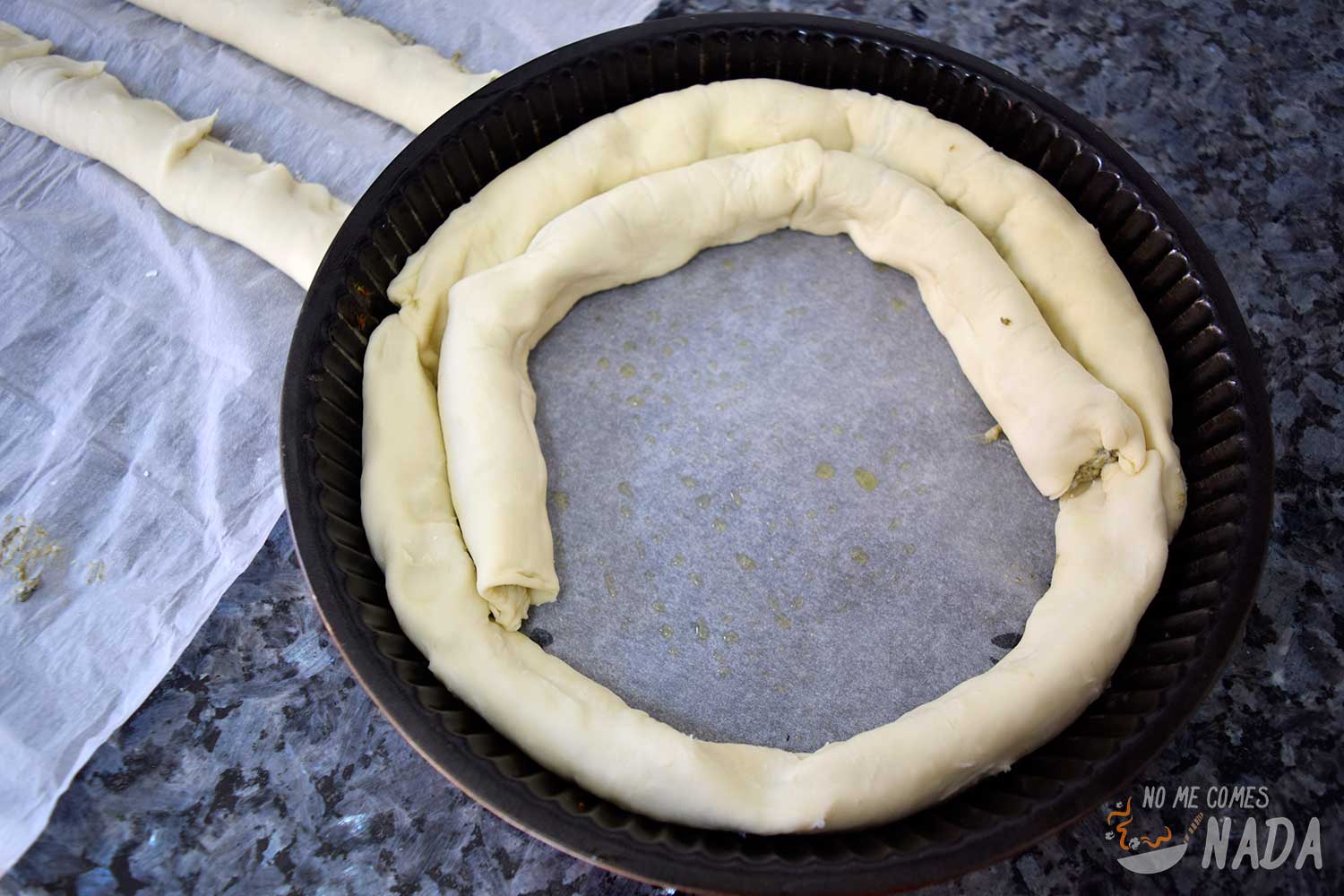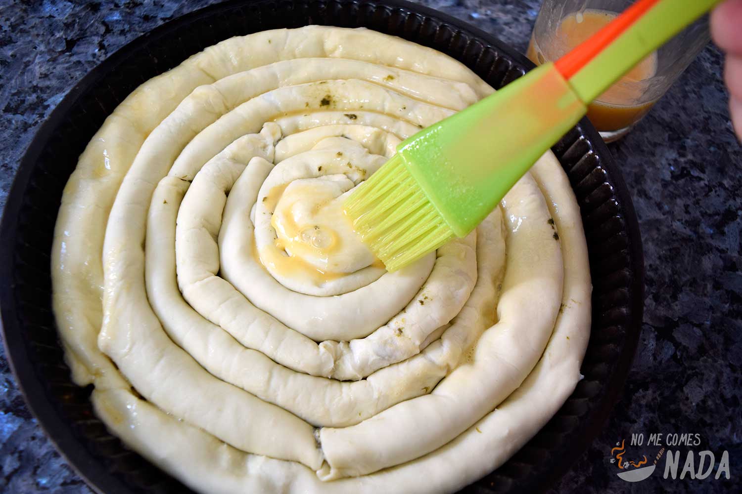 Tomamos un molde redondo de unos 28 cm (con uno de 24 cm, que es la medida más frecuente, sólo os harán falta 7-8 churros) y lo engrasamos con aceite o con mantequilla. Iremos colocando uno a uno los “churros” de hojaldre desde fuera hacia dentro formando una espiral. Pintamos toda la superficie con un huevo batido.