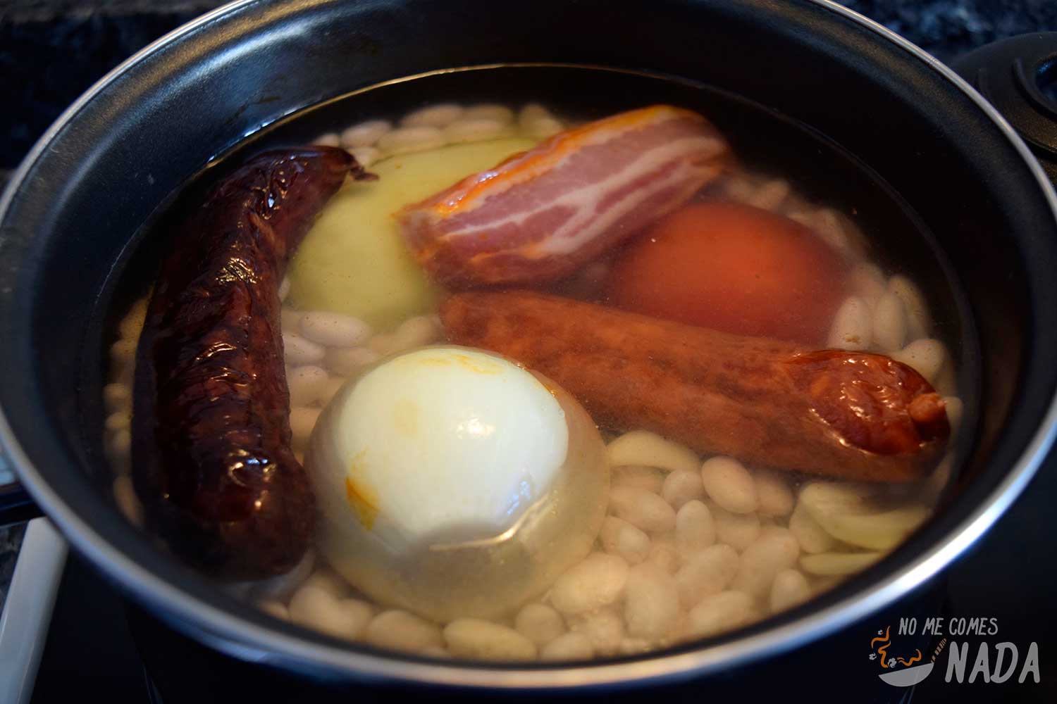Ponemos una olla grande a fuego alto y echamos las alubias, que tenemos en remojo desde la noche anterior, el compango, la cebolla pelada, el tomate, la patata pelada y los dos dientes de ajo. Cubrimos todo de agua hasta tener un par de dedos por encima.