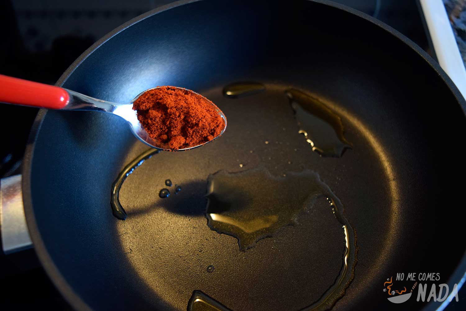 Por otro lado, en un sartén ponemos un chorrito de aceite de oliva virgen extra a fuego medio. Cuando el aceite esté caliente, retiramos la sartén del fuego y echamos una cucharadita de pimentón de la Vera dulce Las Colmenillas, removiendo inmediatamente para tostar un poco el pimentón, con cuidado de que no se nos queme. Incorporamos el pimentón a la olla con el resto de ingredientes. Podéis saltaros este paso y echar directamente le pimentón a la olla, pero al tostarlo un poco le da mejor sabor.