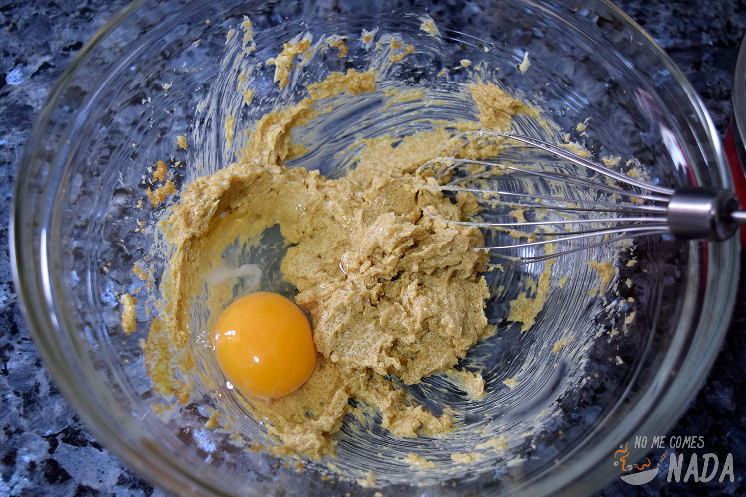 Con la mantequilla o margarina a temperatura ambiente, la ponemos en el bol donde vayamos a hacer la masa junto con el azúcar moreno y la esencia de vainilla. Con una batidora de varillas, mezclamos hasta que todos los ingredientes estén bien integrados. Añadimos el huevo y volvemos a batir hasta que obtengamos una mezcla homogénea.
